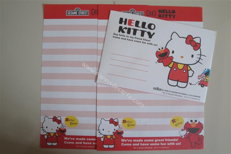 Conjunto importado, de papel de carta com 2 folhas iguais e 1 envelope da Hello Kitty. Participação especial do Elmo da Sesame Street (Vila Sésamo).