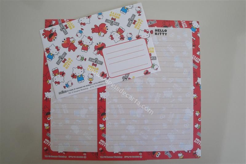 Conjunto importado, de papel de carta com 2 folhas iguais e 1 envelope da Hello Kitty. Participação especial do Elmo da Sesame Street (Vila Sésamo).
