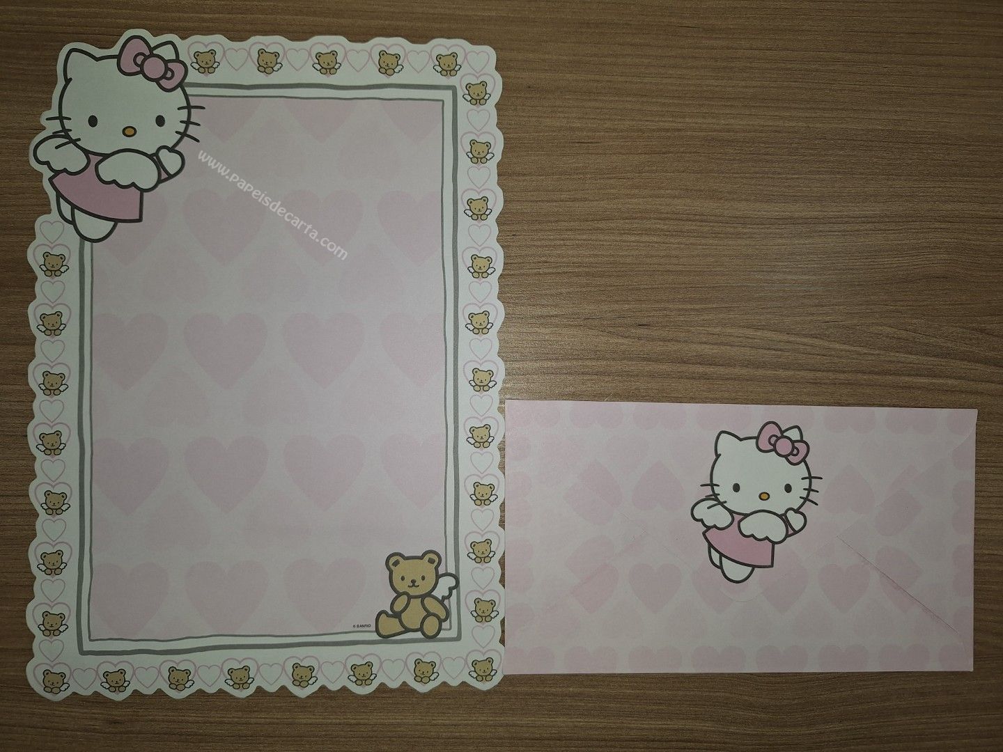 Conjunto de Papel de carta da Hello Kitty, Sanrio, com 1 folha e 1 envelope. Tamanho um pouco maior que o médio. Larg:18,5cm x alt: 26cm.