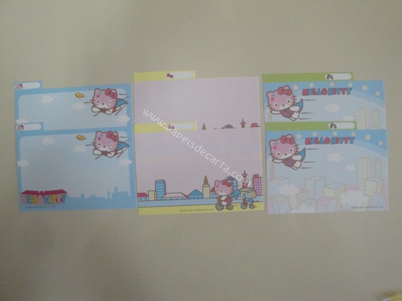 Conjunto importado, de papel de carta com 6 notinhas, sendo 2 de cada modelo da Hello Kitty.