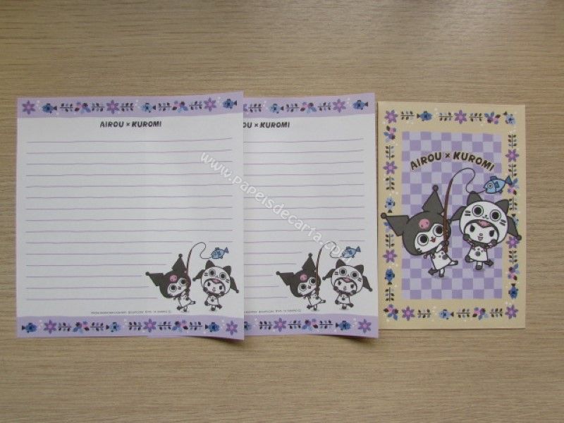 Conjunto importado, de papel de carta da Hello Kitty, com 2 folhas iguais e 1 envelope, da Sanrio. Coleção: Airou x Kuromi