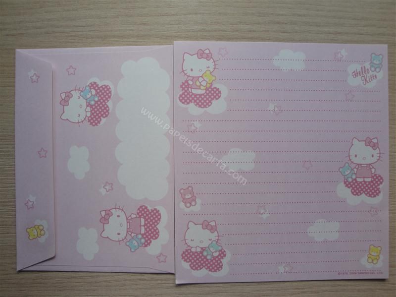 Conjunto de papel de carta da Hello Kitty com 1 folha diferente e 1 envelope.