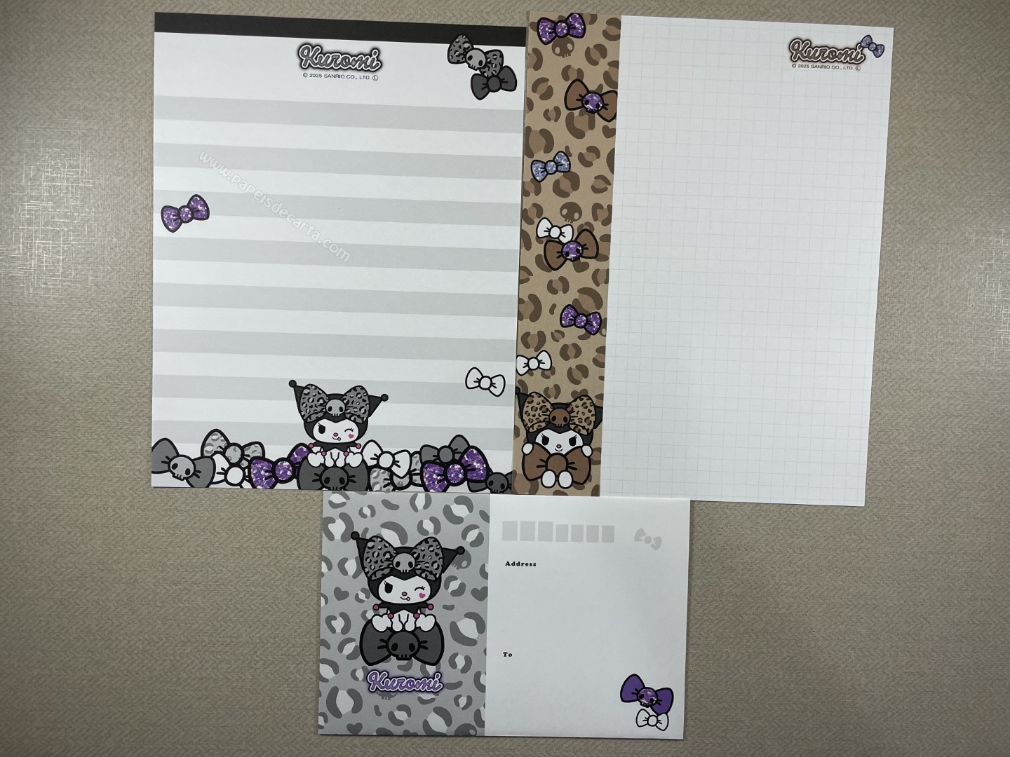 Conjunto importado de papel de carta, com 2 folhas e 1 envelope, da Kuromi - Sanrio. Tamanho médio.