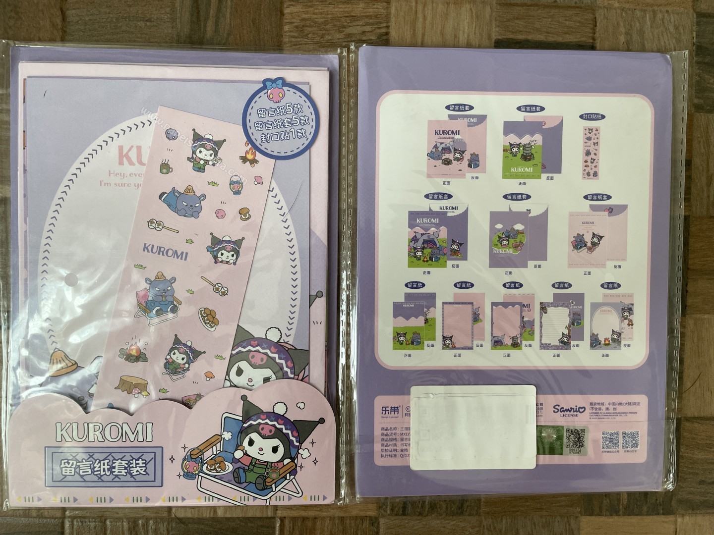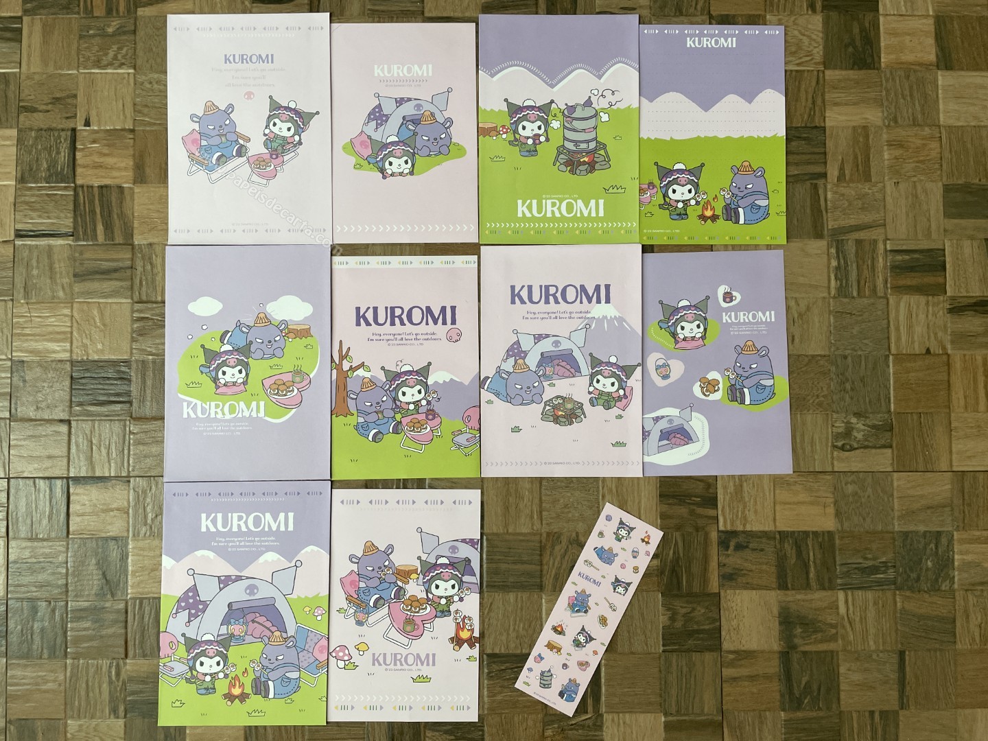 Lote de papel de carta importado da Kuromi - Sanrio, com 5 conjuntos diferentes com 1 folha e 1 envelope cada + 1 cartela de adesivos. Tamanho da folha: 12,5 cm (larg) X 19 cm (alt). Tamanho do envelope: 13,5 cm (larg) x 20cm (alt). Folha e envelope tem desenho frente e verso.