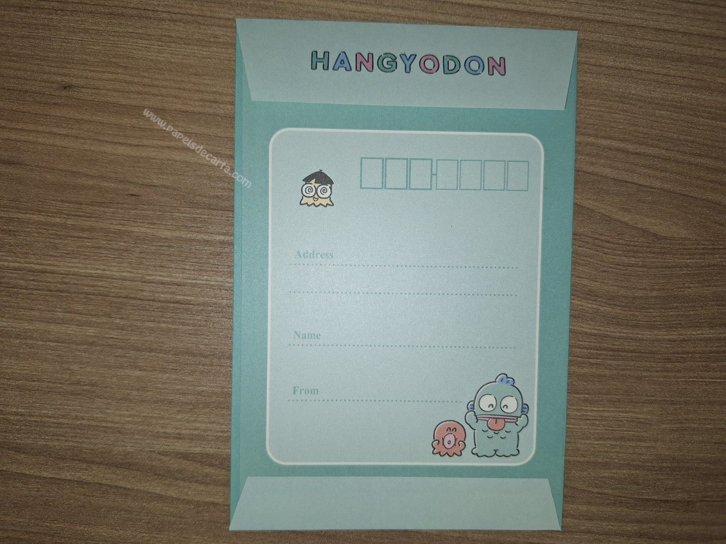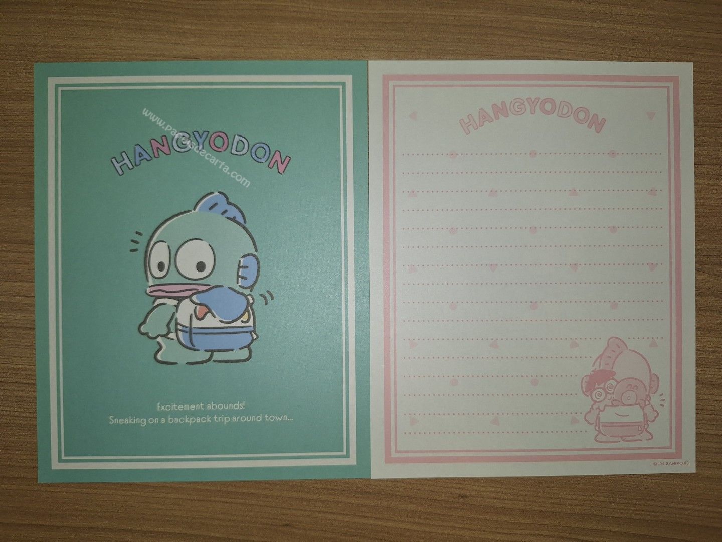 Conjunto importado, de papel de carta com 2 folhas iguais e 1 envelope e 1 cartelinha de adesivos do Hangyodon, da Sanrio.