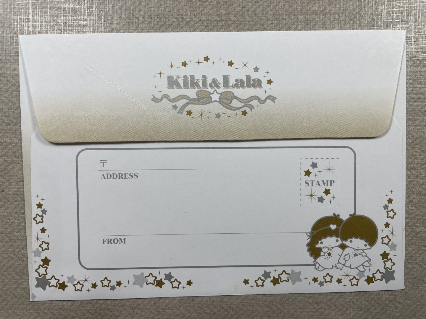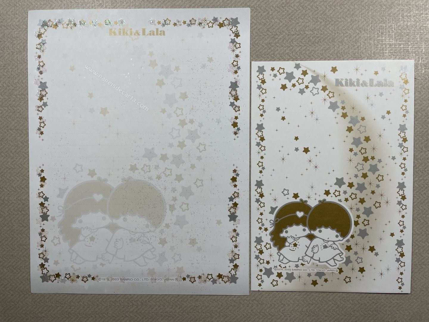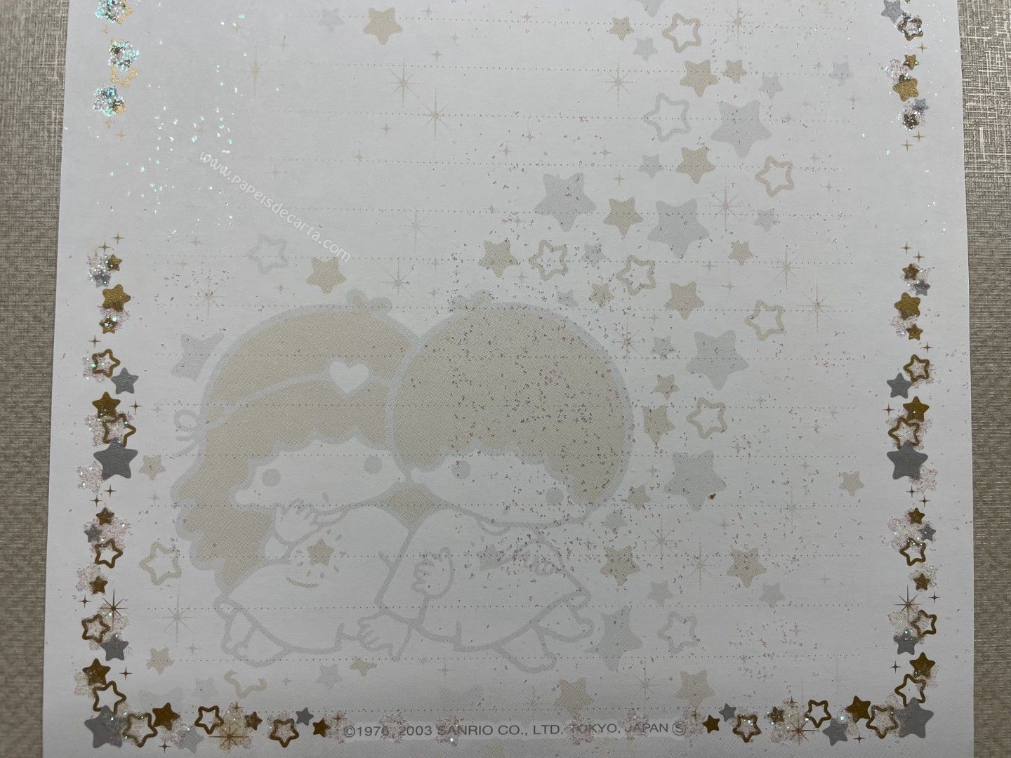 Conjunto importado de papel de carta dos Little Twin Stars, com 1 folha e 1 envelope. Tamanho médio. O Papel possui glitter. Fabricante: Sanrio.