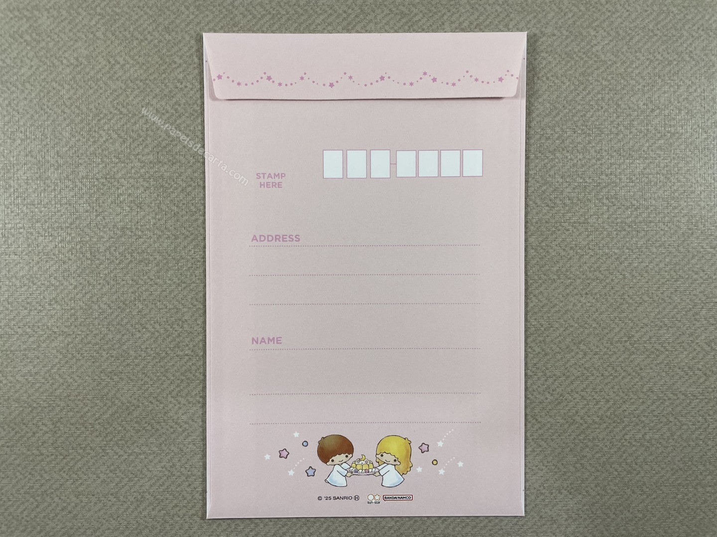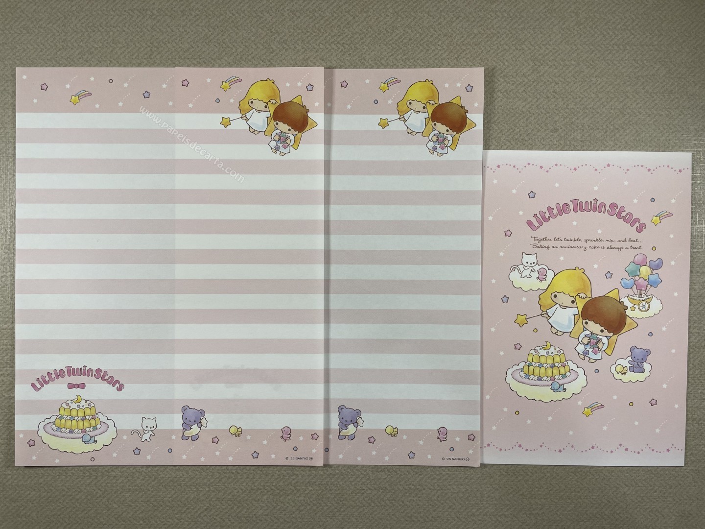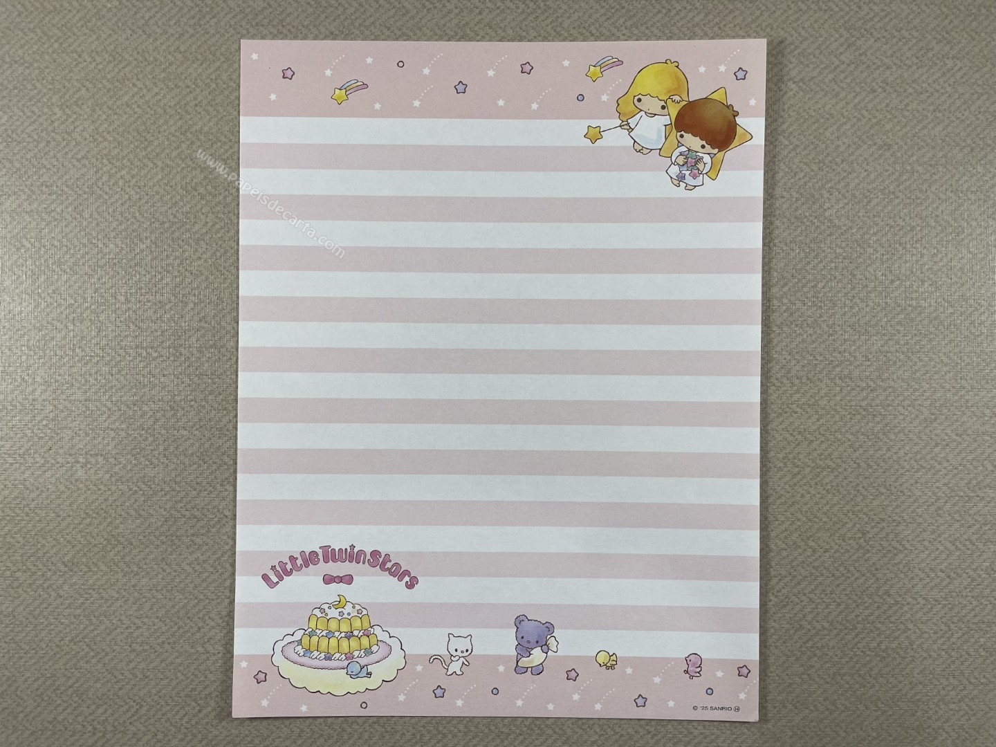 Conjunto importado de papel de carta dos Little Twin Stars, com 2 folhas e 1 envelope. Tamanho médio. Fabricante: Sanrio.