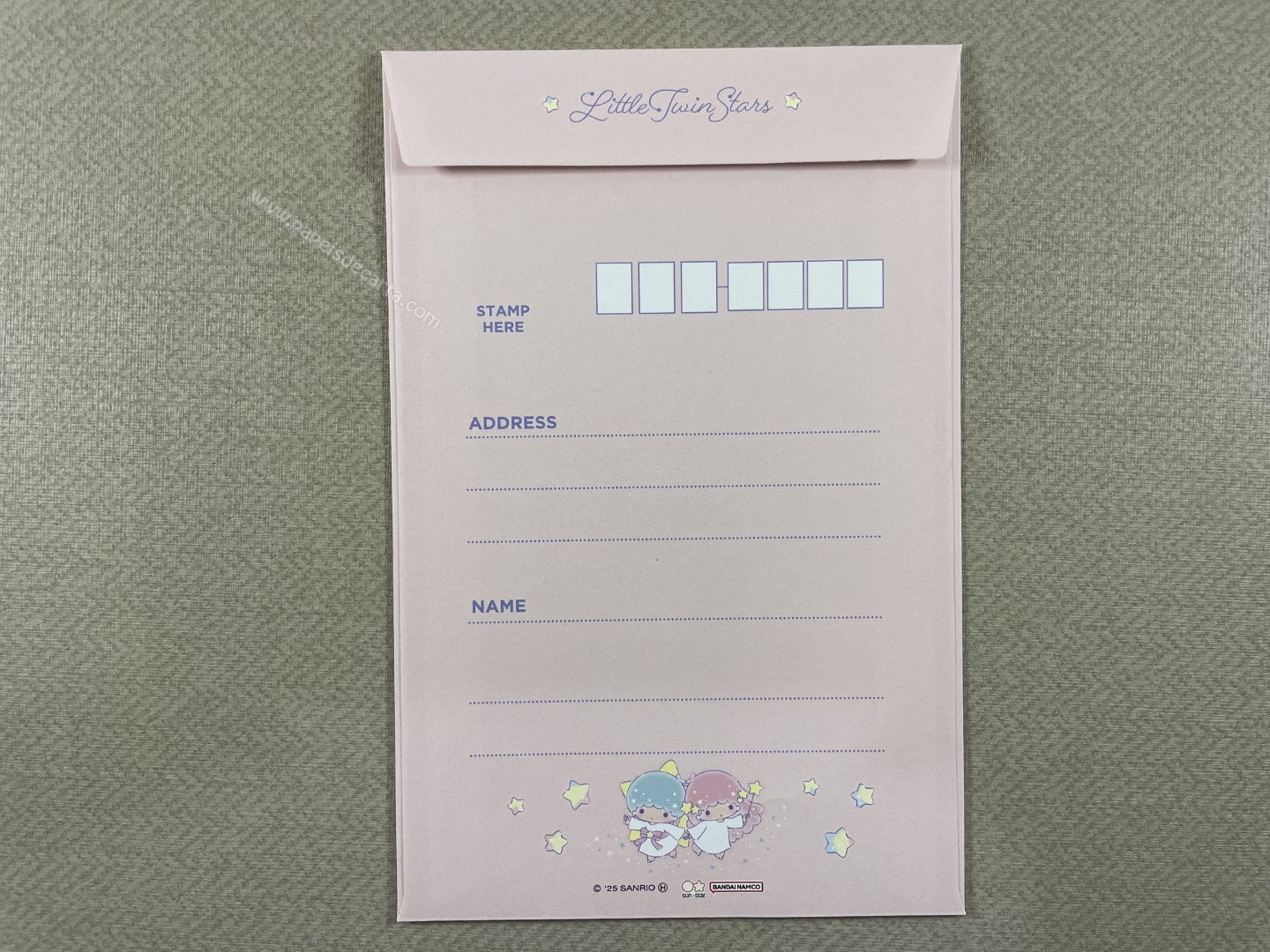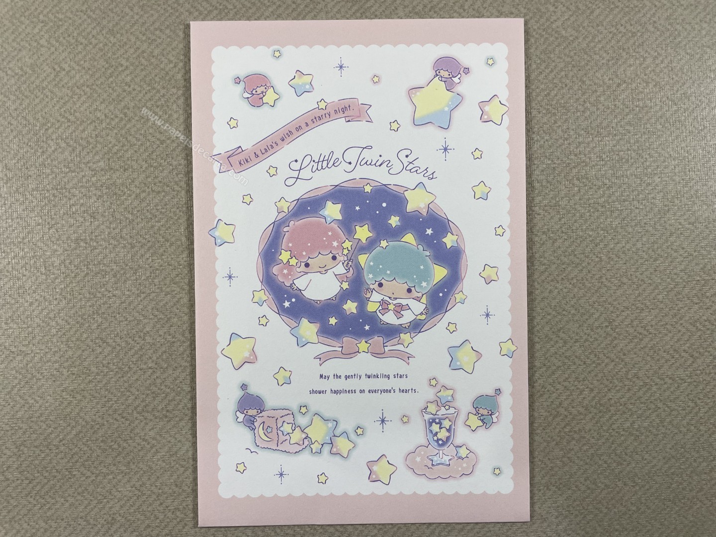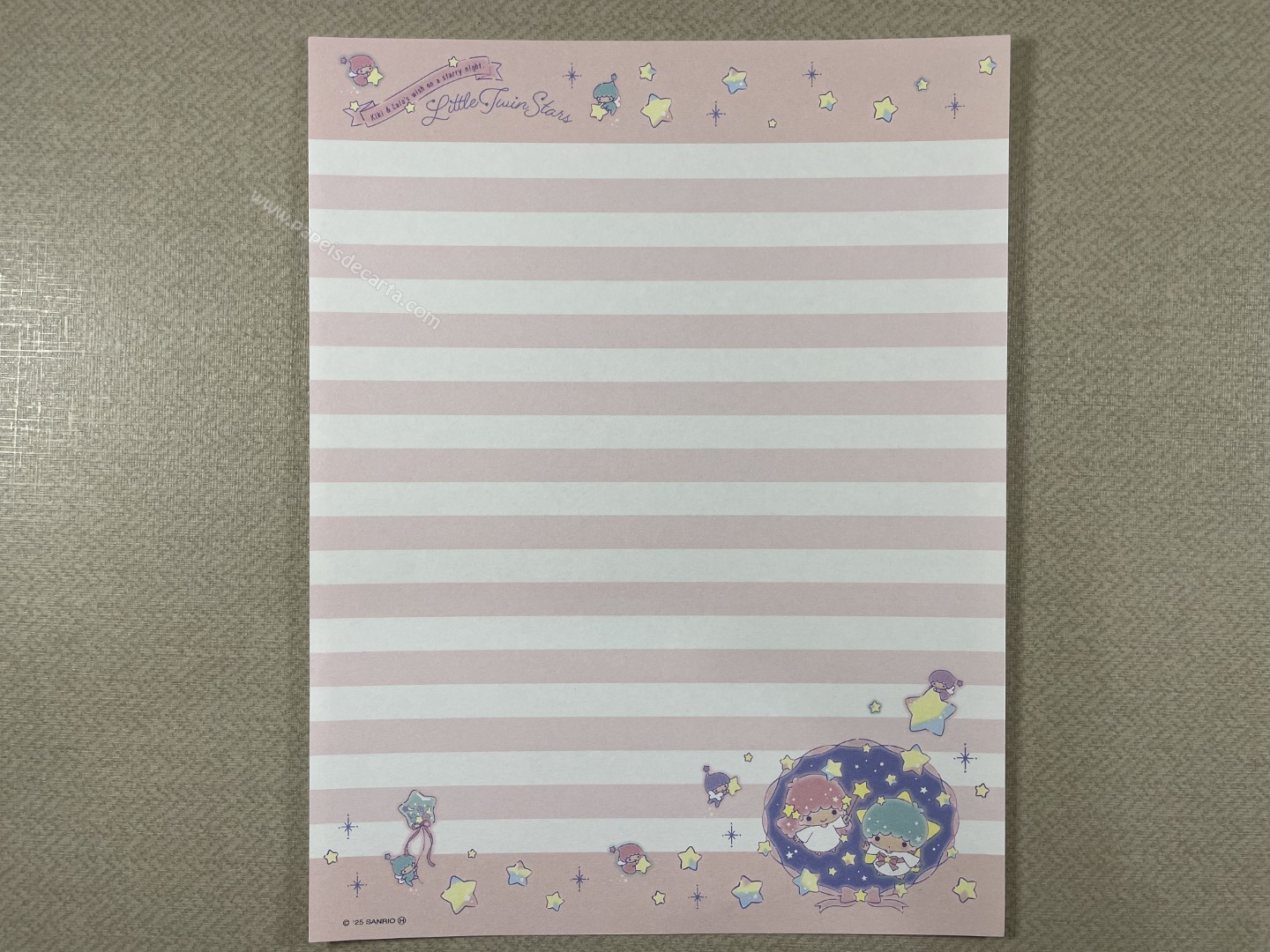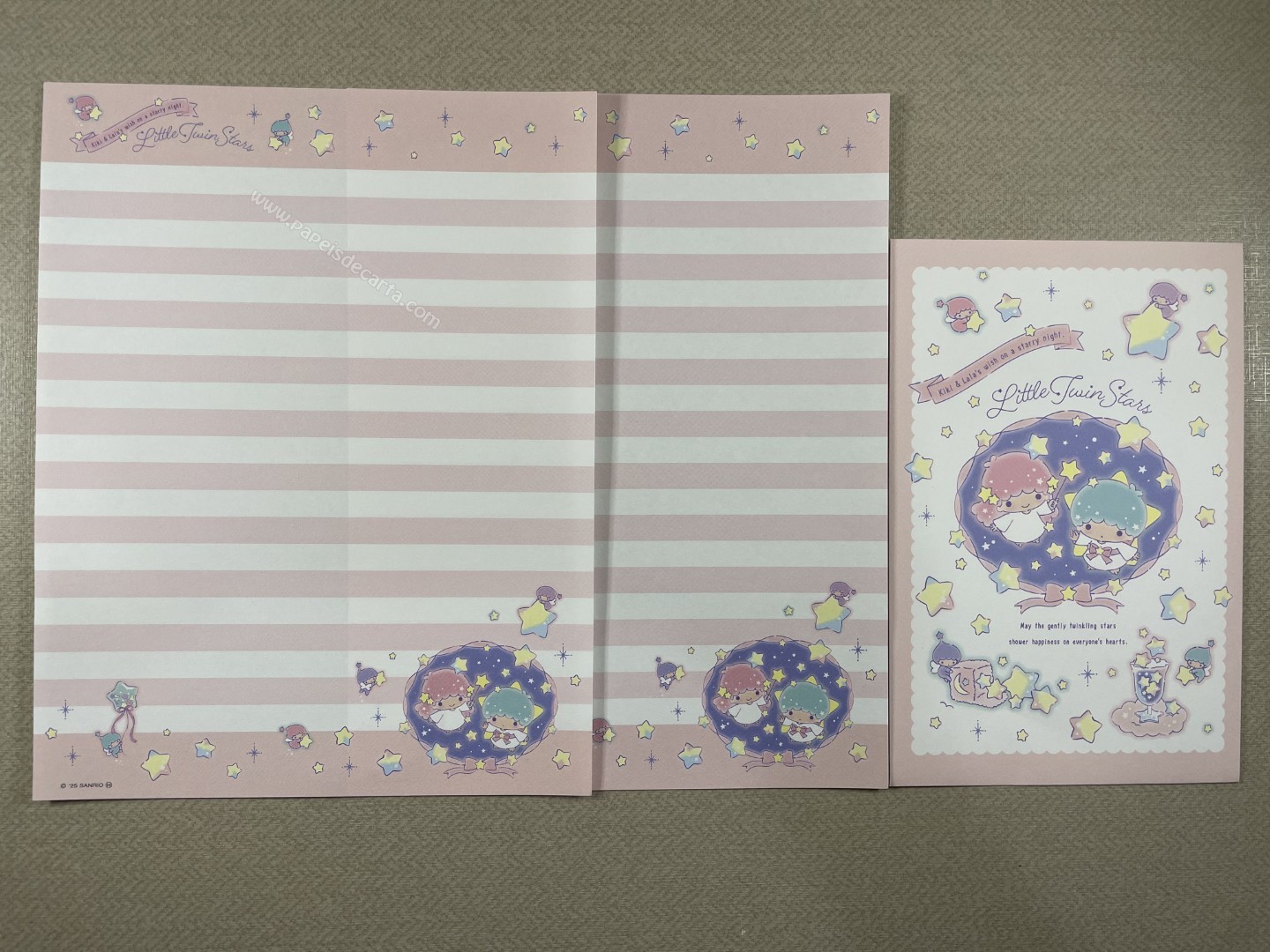 Conjunto importado de papel de carta dos Little Twin Stars, com 2 folhas e 1 envelope. Tamanho médio. Fabricante: Sanrio.