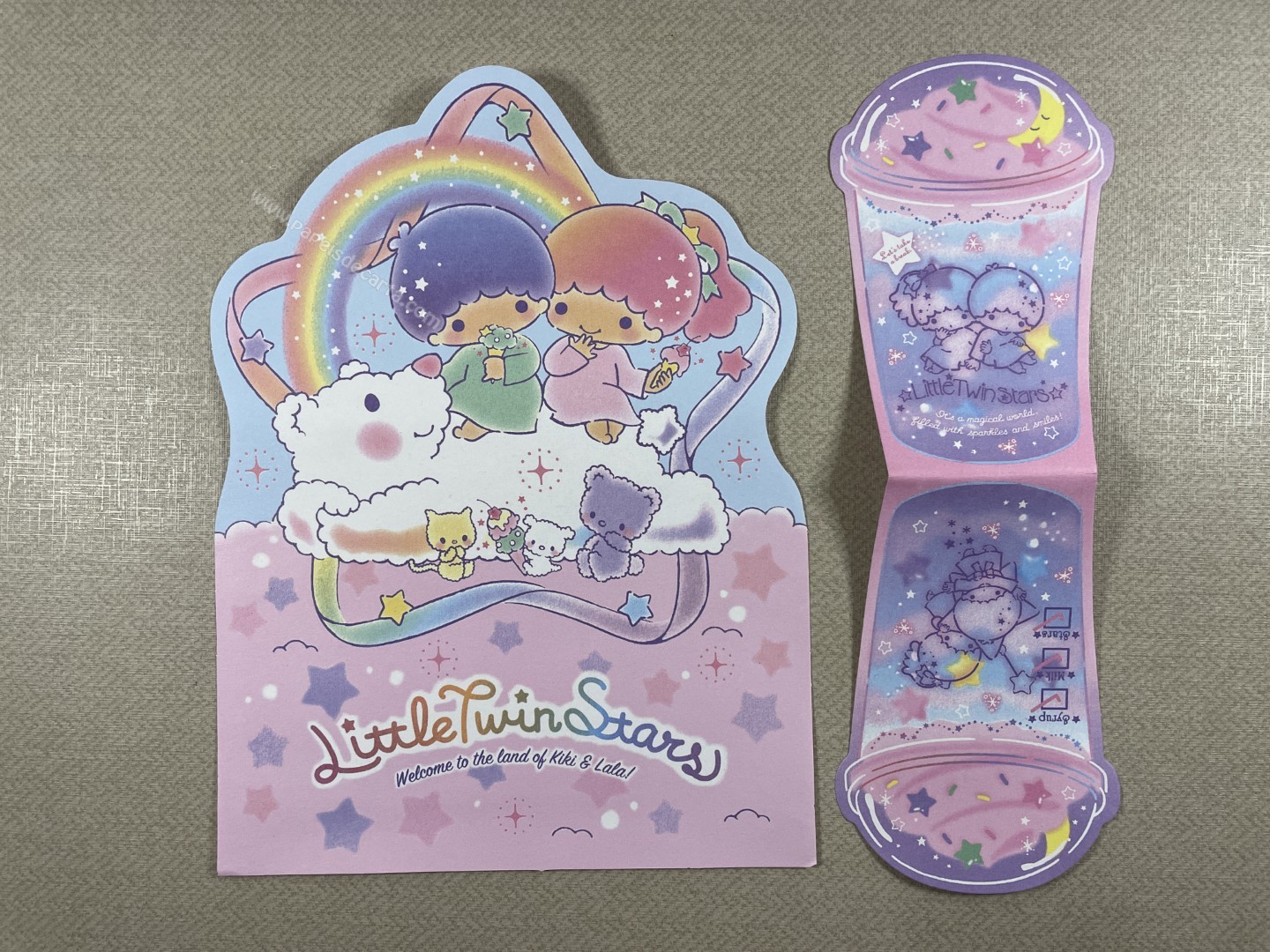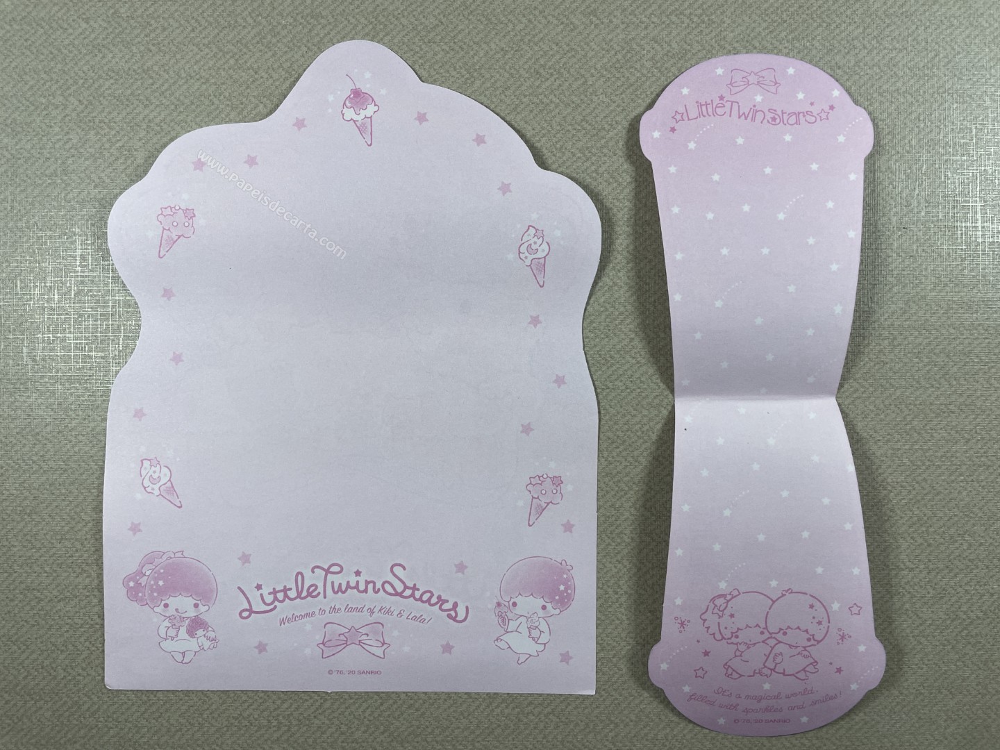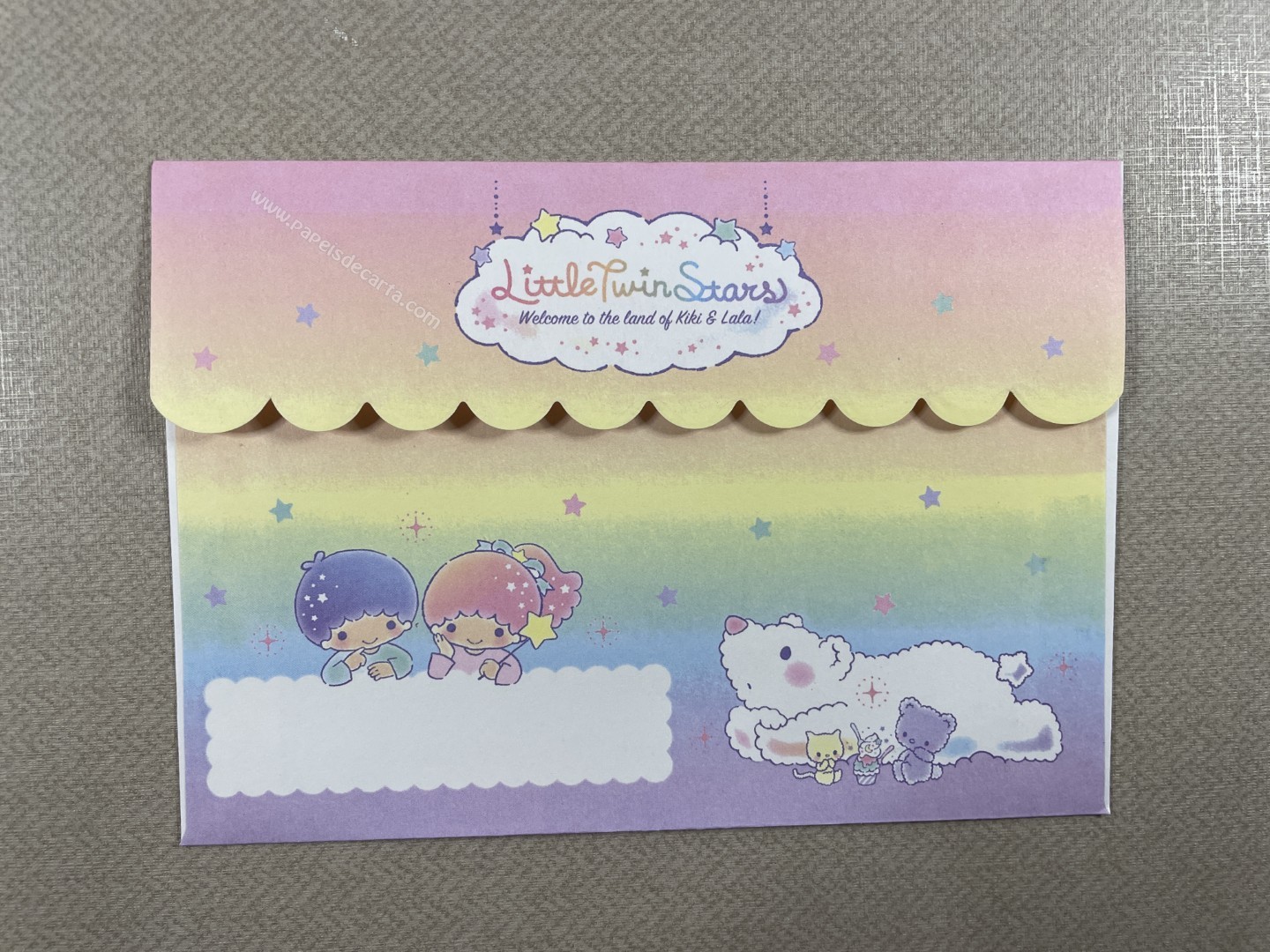 Conjunto importado de papel de carta dos Little Twin Stars, com 1 folha, 1 notinha e 1 envelope. Tamanho médio. Fabricante: Sanrio.