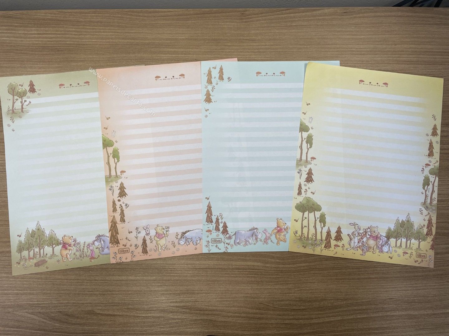 Lote com 4 folhas diferentes de papel de carta do Ursinho Pooh, tamanho médio.