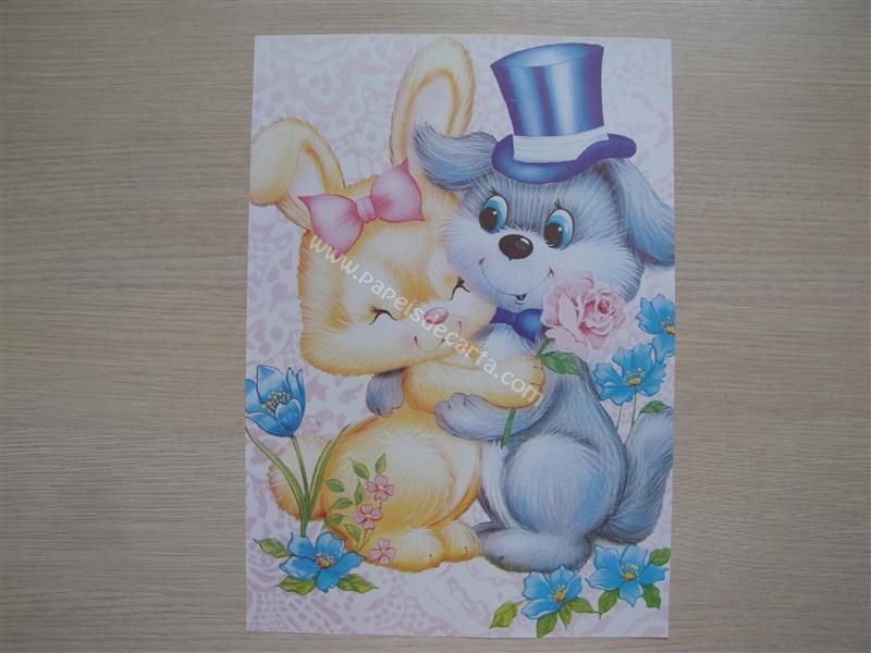 Papel de carta grande antigo com uma coelhinha abraçando um cachorrinho.