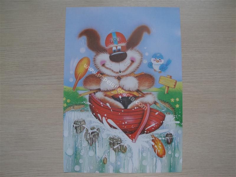 Papel de carta grande antigo com um cachorro descendo uma cachoeira com um barco e remos quebrados.