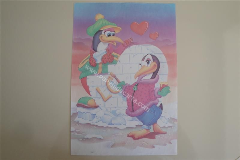 Papel de carta grande, antigo, com um casal de pinguins arrumando seu iglu.