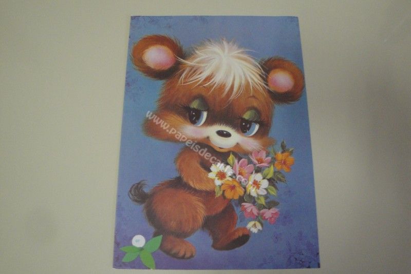 Papel de carta antigo, de tamanho grande (A4), com uma ursinha segurando um maço de flores. Coleção: - Número: 07