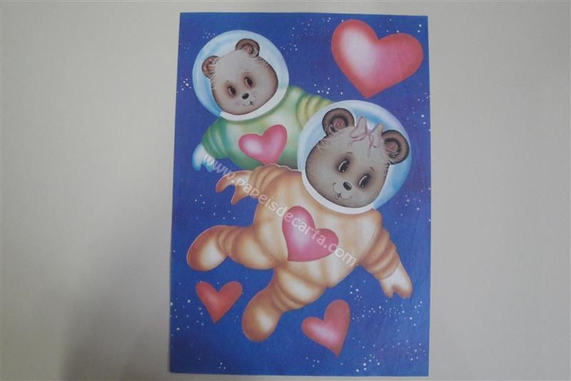 Papel de carta antigo, de tamanho grande (A4), com um casal de ursinhos astronautas voando pelo espaço. Coleção: - Número: -