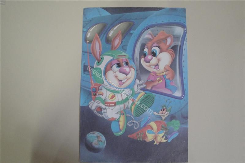 Papel de carta grande, antigo, com dois coelhinhos astronautas.