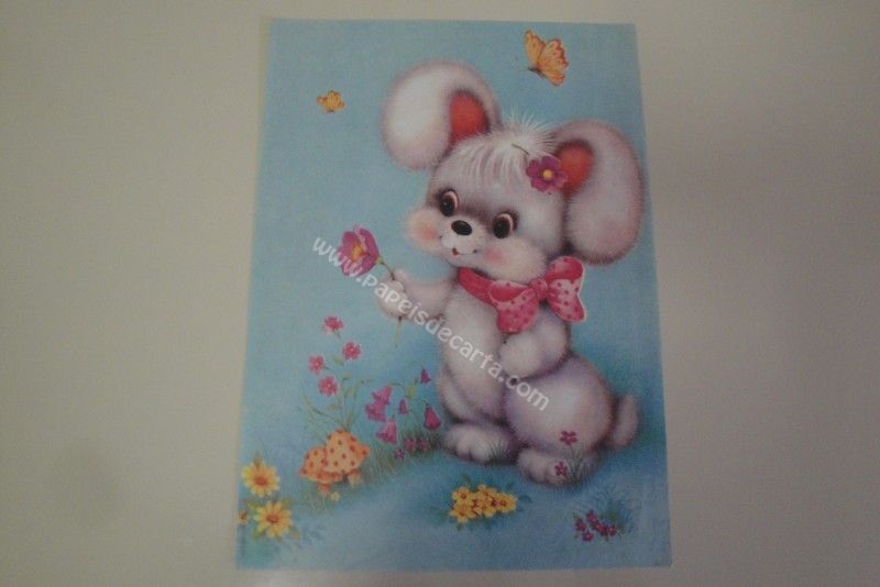 Papel de carta grande, antigo, com uma coelhinha cinza segurando uma flor rosa. Obs: Papel da linha Pop Cart. Número: 502 - RJ