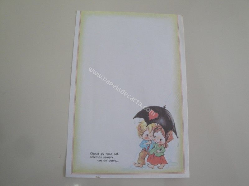Papel de carta antigo com 1 folha tamanho médio. Possui a frase: Chova ou faça sol, seremos sempre um do outro...