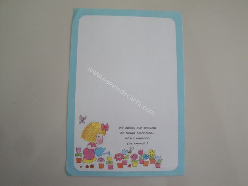 Papel de carta antigo com 1 folha tamanho médio. Possui a frase: Há coisas que crescem de forma espantosa... Nossa amizade por exemplo!