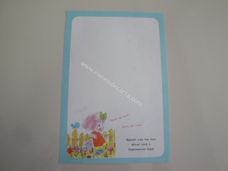 Papel de carta antigo com 1 folha tamanho médio. Possui a frase: Repetir não faz mal, afinal você é duplamente legal.