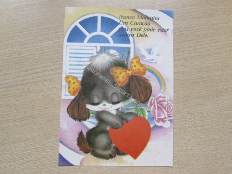 Papel de carta antigo, tamanho médio, de coleção não identificada. Frase: Nunca maltrates um coração pois você pode estar dentro dele.