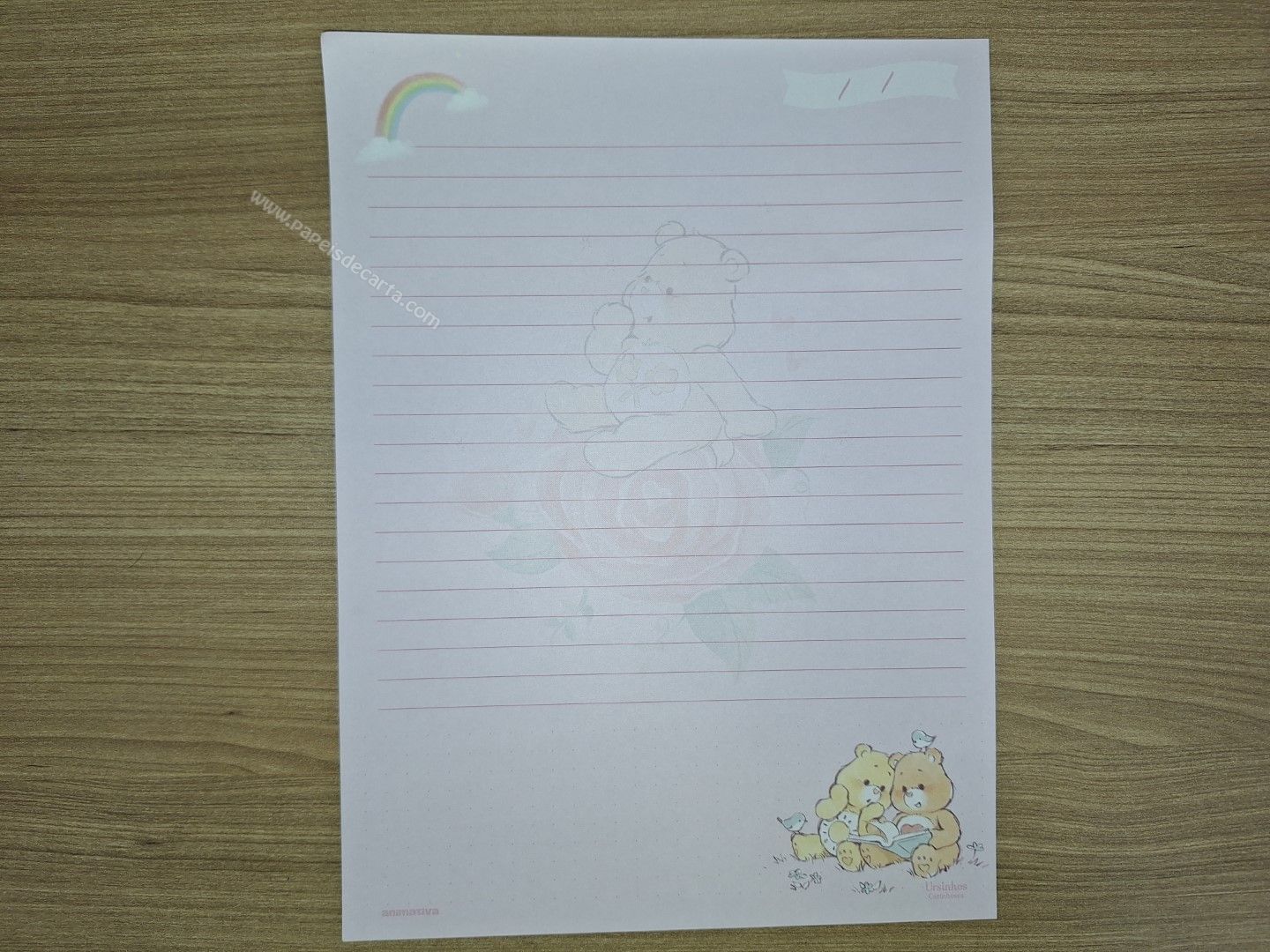 Lote de papel de carta dos Ursinhos Carinhosos (Care Bears) com 8 folhas diferentes, tamanho um pouco maior que o médio.