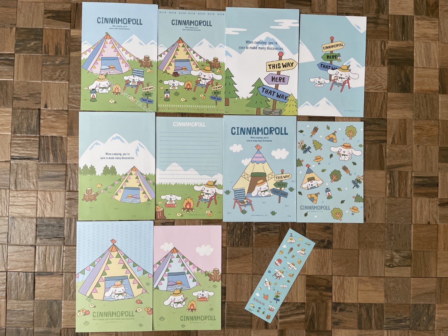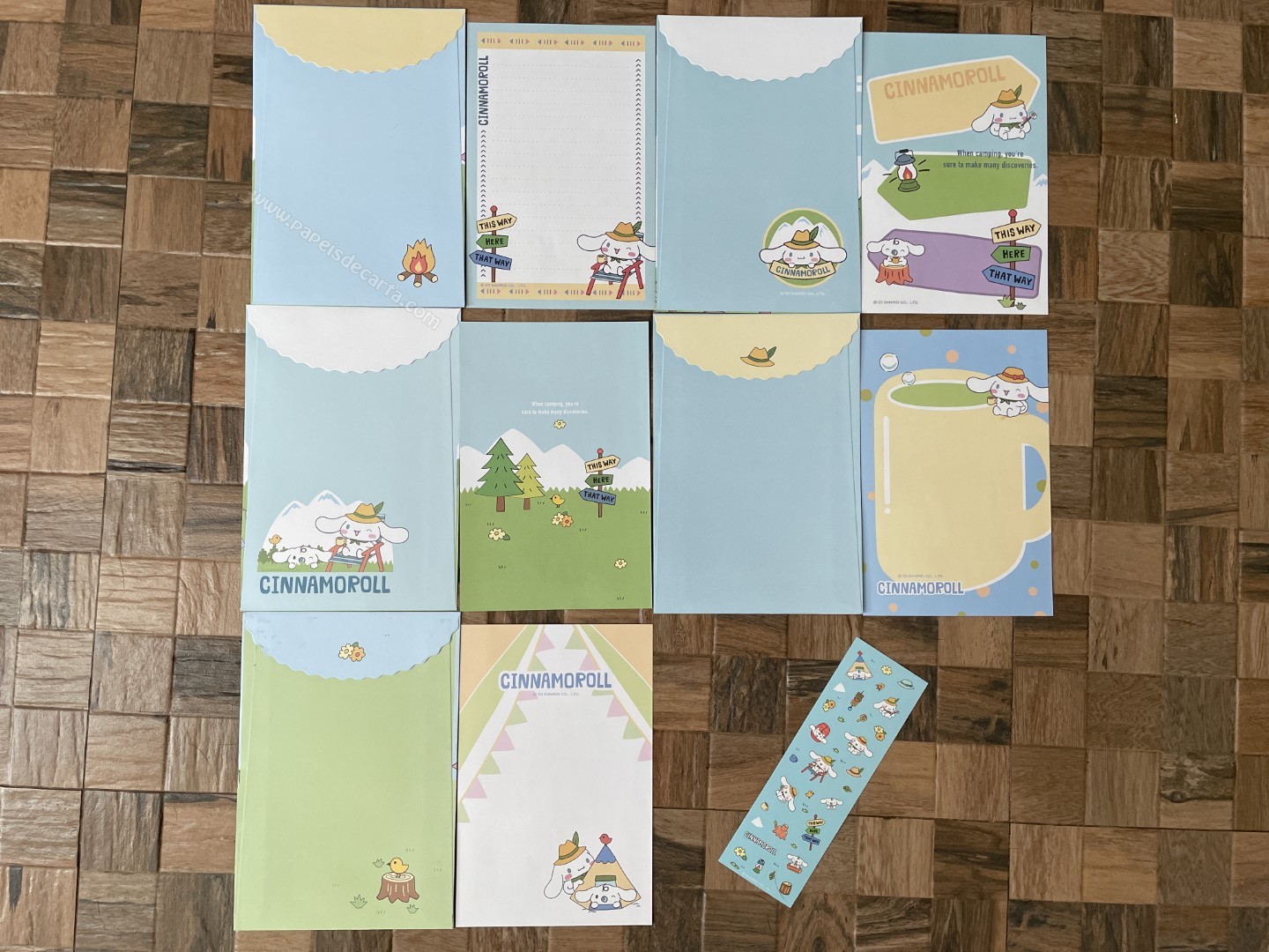 Lote de papel de carta importado do Cinnamoroll - Sanrio, com 5 conjuntos diferentes com 1 folha e 1 envelope cada + 1 cartela de adesivos. Tamanho da folha: 12,5 cm (larg) X 19 cm (alt). Tamanho do envelope: 13,5 cm (larg) x 20cm (alt). Folha e envelope tem desenho frente e verso.