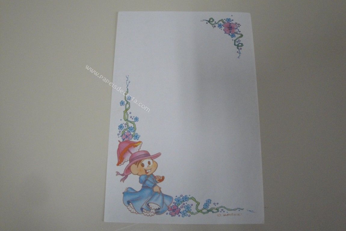 Papel de carta antigo, modelo raro, da coleção Turma da Mônica, com a Mônica passeando no jardim com uma sombrinha.