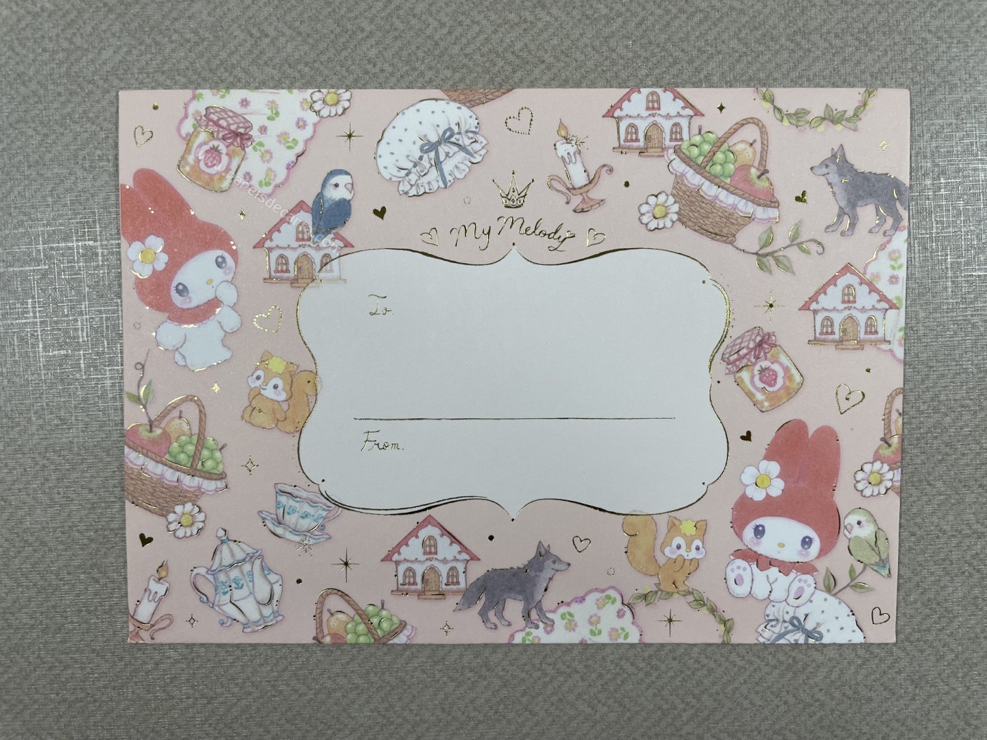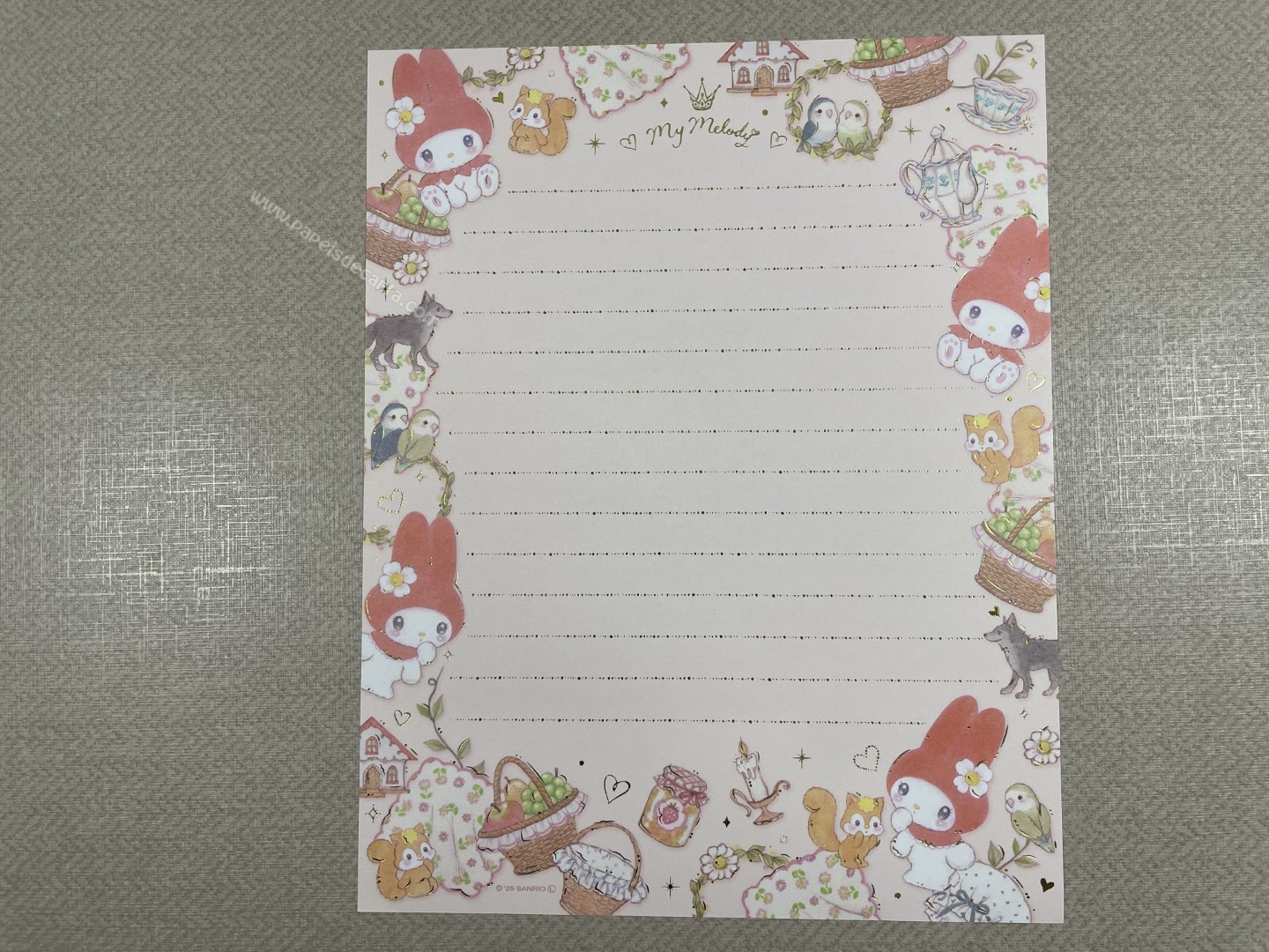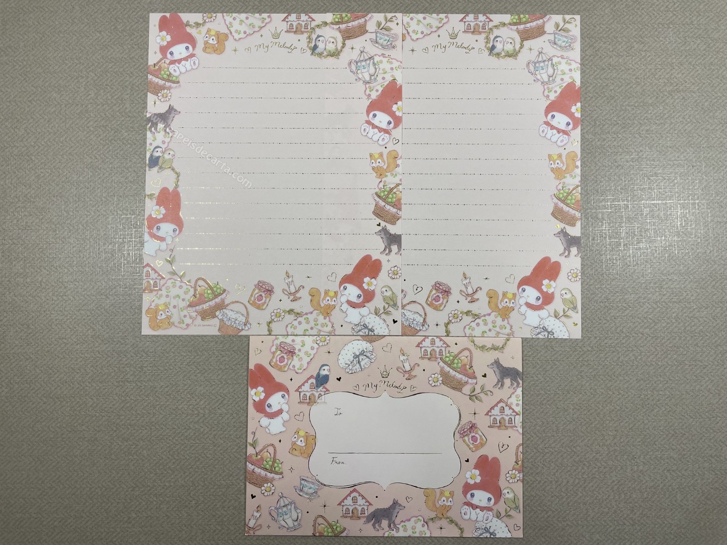 Conjunto de Papel de carta importado da My Melody com 2 folhas e 1 envelope. Tamanho médio. Possui detalhes em dourado.