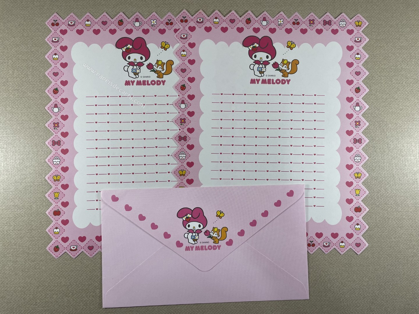 Conjunto de Papel de carta da My Melody com 2 folhas e 1 envelope. Tamanho um pouco maior que o médio.