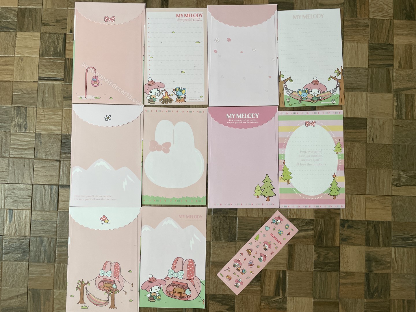 Lote de papel de carta importado da My Melody - Sanrio, com 5 conjuntos diferentes com 1 folha e 1 envelope cada + 1 cartela de adesivos. Tamanho da folha: 12,5 cm (larg) X 19 cm (alt). Tamanho do envelope: 13,5 cm (larg) x 20cm (alt). Folha e envelope tem desenho frente e verso.