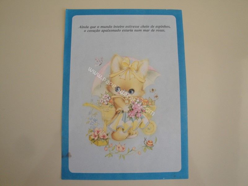 Papel de carta antigo, tamanho médio, raro, da coleção "Borda Azul". Frase: Ainda que o mundo inteiro estivesse cheio de espinhos, o coração apaixonado estaria num mar de rosas. Obs: O papel está um pouco manchado.