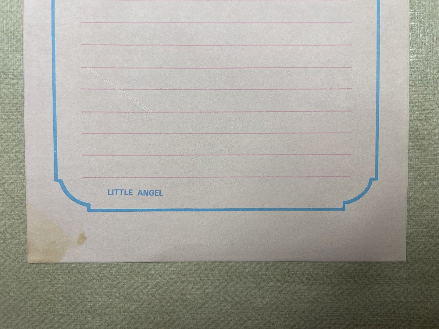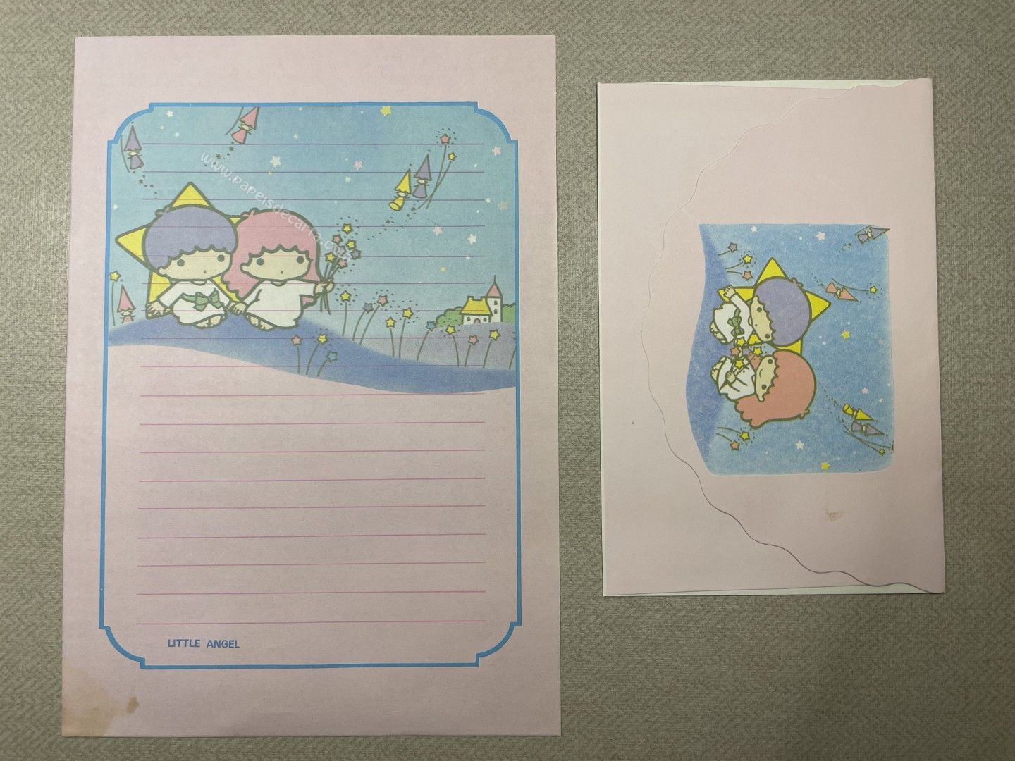 Conjunto de papel de carta antigo da coleção Little Angel, com 1 folha, 1 envelope. ** PAPEL COM AVARIA. OBSERVAR FOTO.**