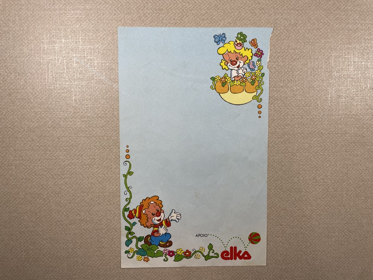 Papel de carta antigo da coleção Elka. Tamanho menor que o médio. **PAPEL COM AVARIA. VER FOTO.**