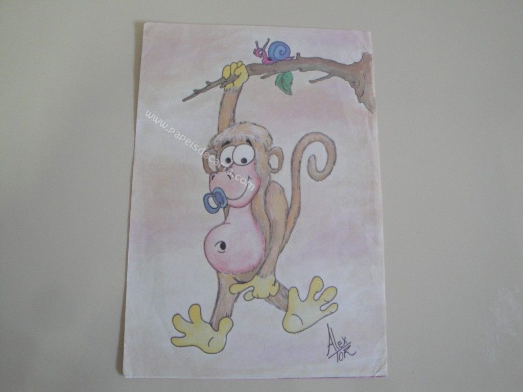 Papel de carta antigo, tamanho médio, da coleção Alex Tor, sem número. Um macaco com uma chupeta, pendurado no galho de uma árvore.