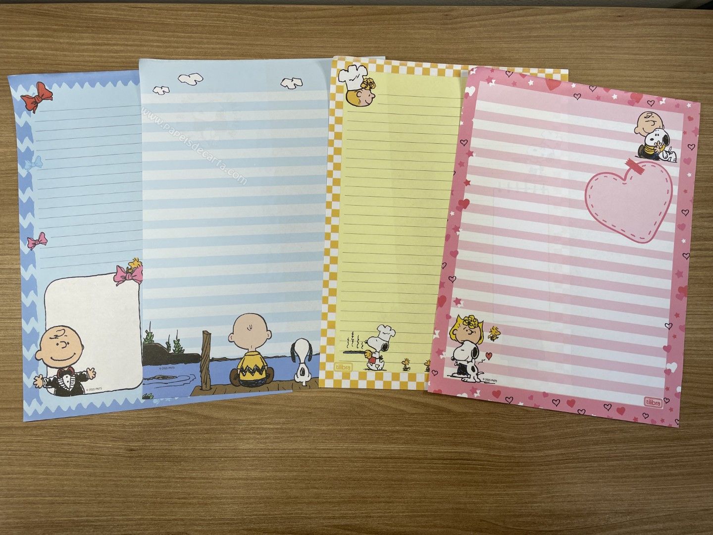 Lote com 4 folhas diferentes de papel de carta do Snoopy, tamanho médio.
