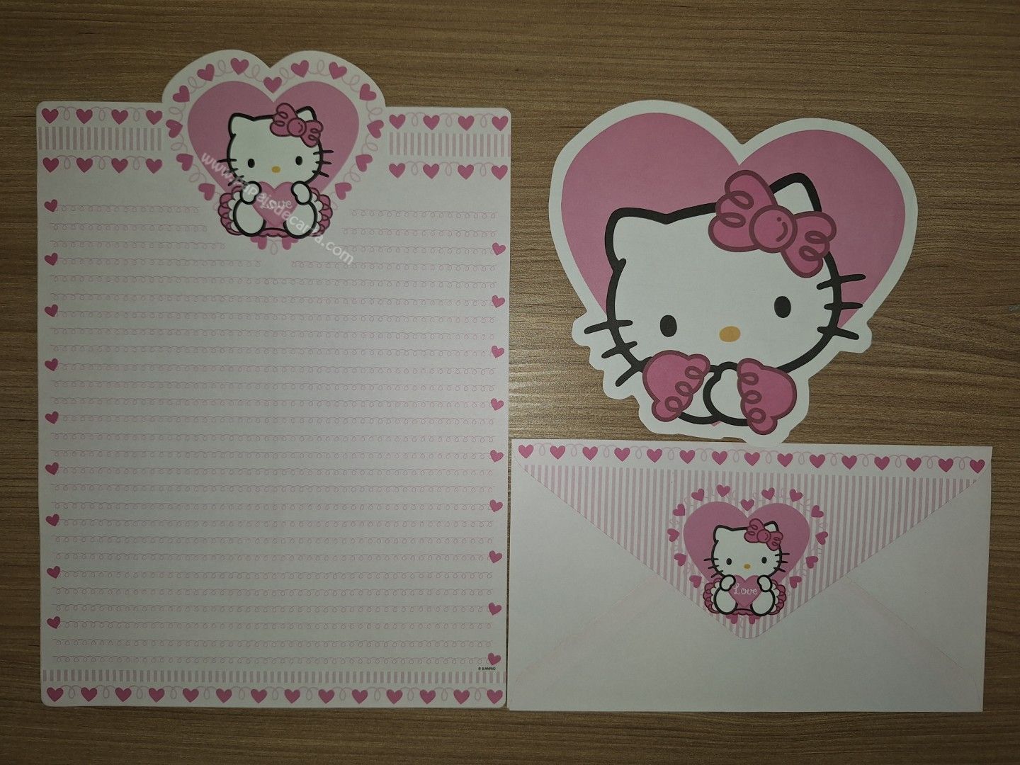 Conjunto de Papel de carta da Hello Kitty, Sanrio, com 1 folha, 1 notinha e 1 envelope. Tamanho um pouco maior que o médio. Larg:18,5cm x alt: 24cm.