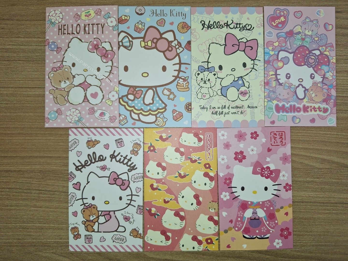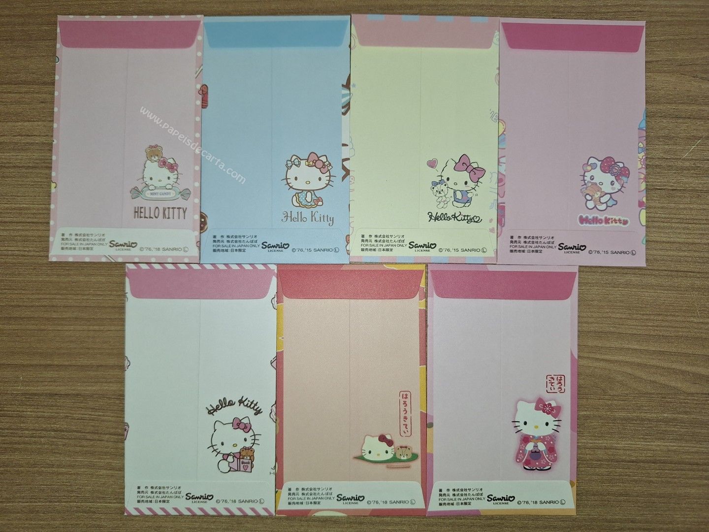 Lote com 7 envelopes diferentes da Hello Kitty - Sanrio. Tamanho dos envelopes: 6cm larg x 10,5cm alt.