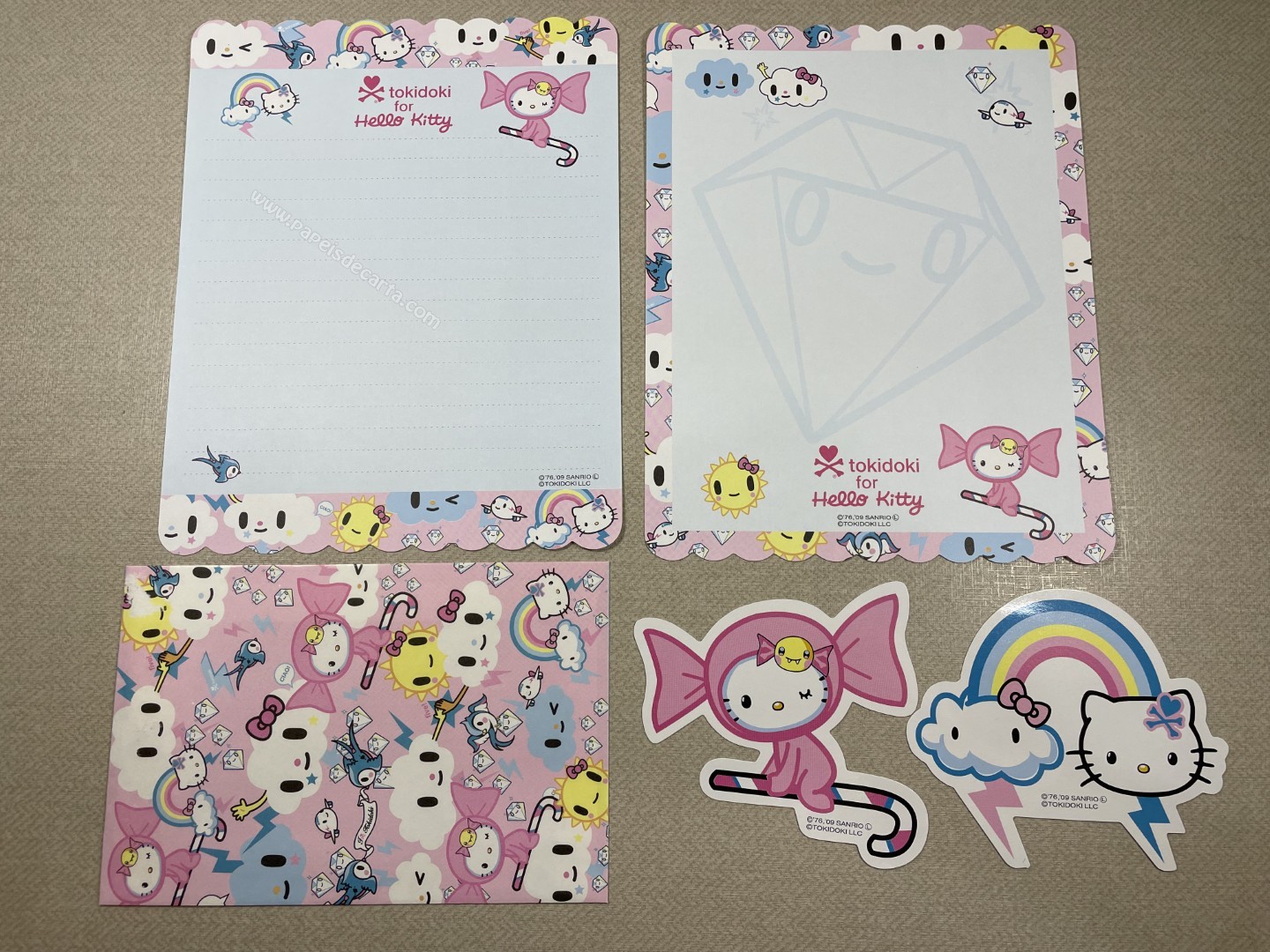 Conjunto de papel de carta importado, tamanho médio, com 2 folhas, 2 memos e 1 envelope, da Hello Kitty - Sanrio. Coleção Tokidoki.
