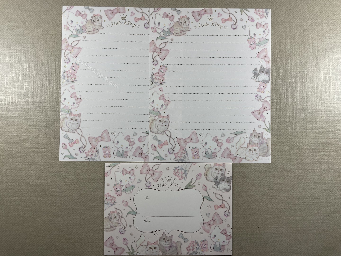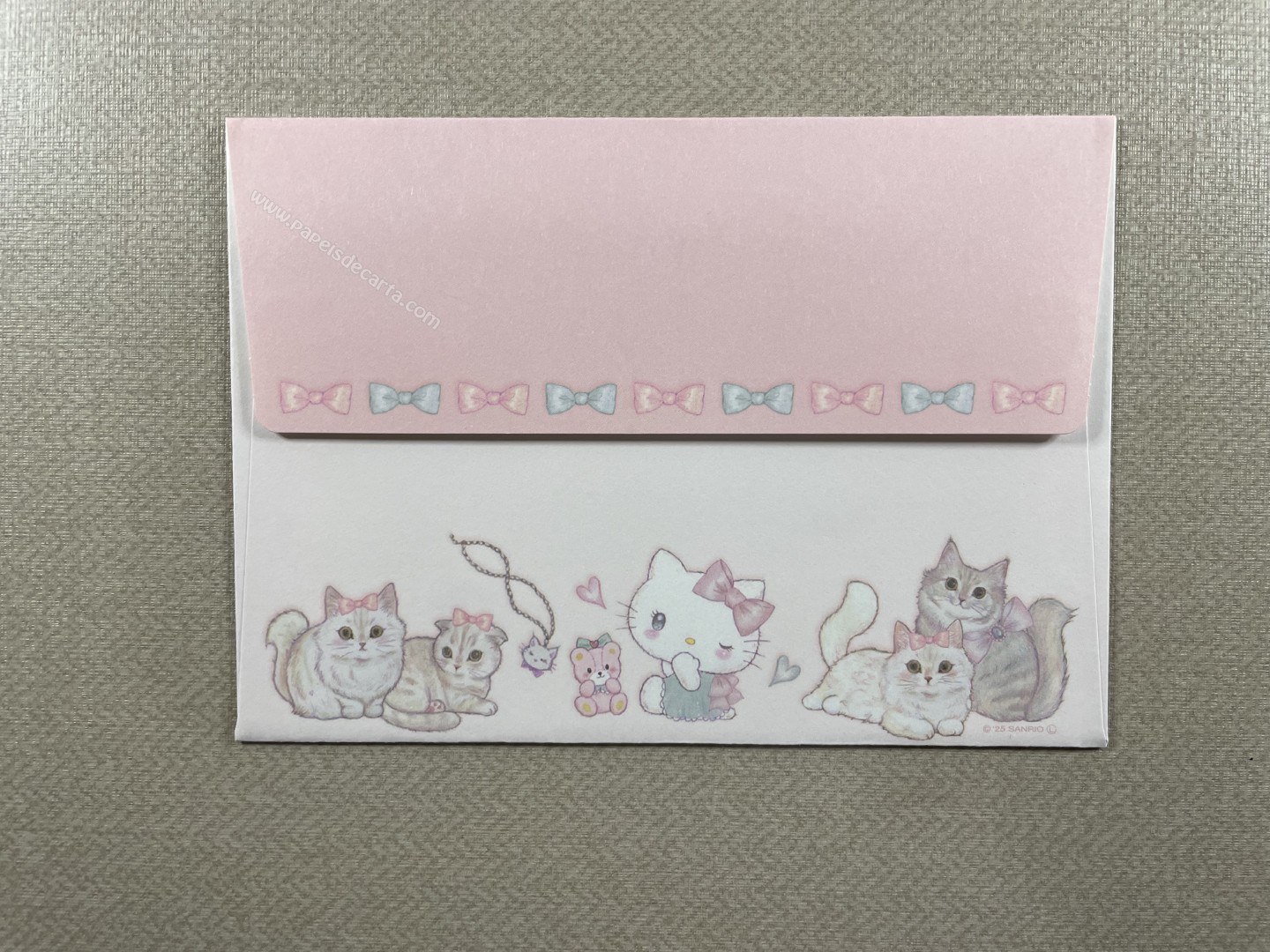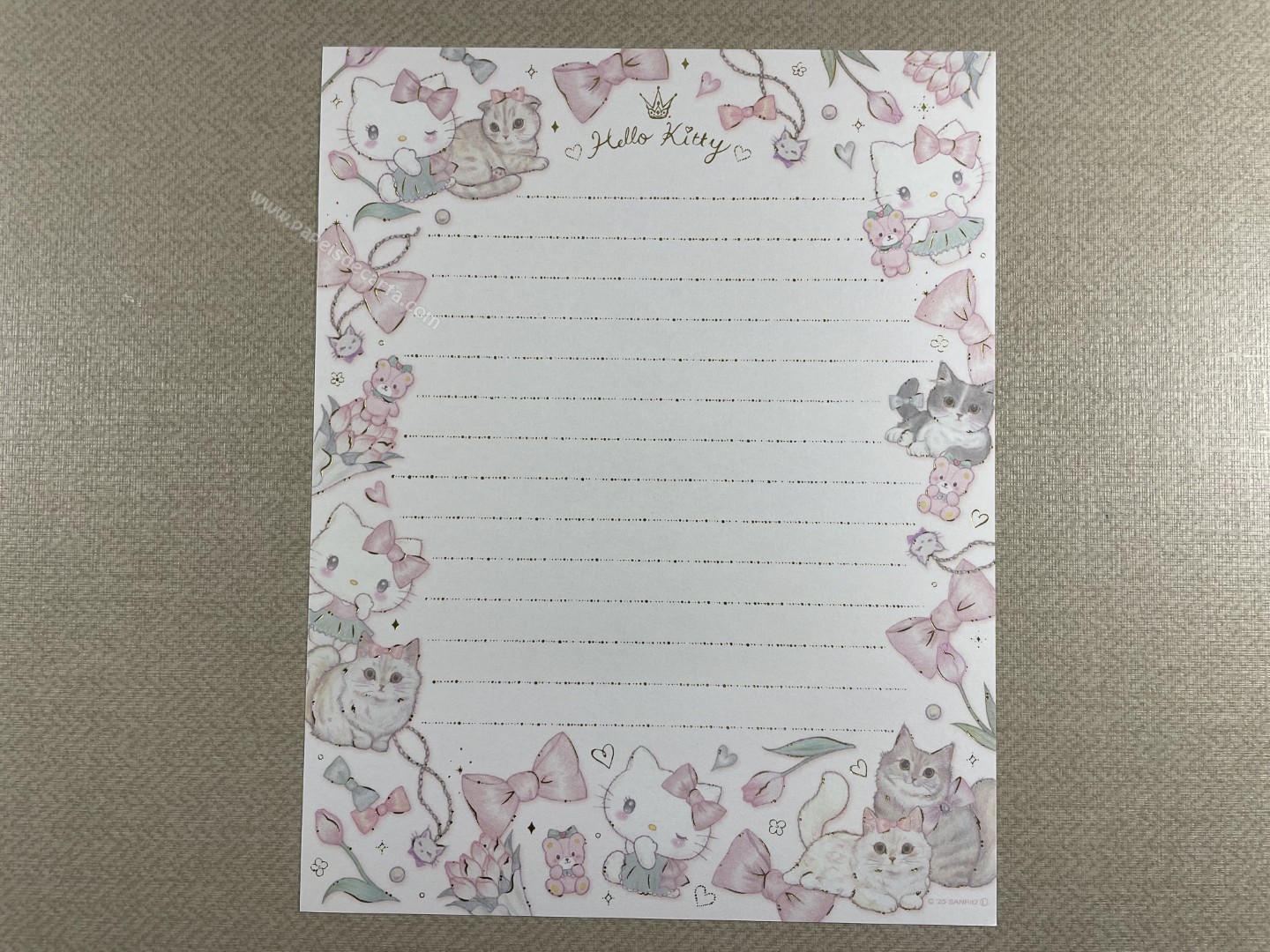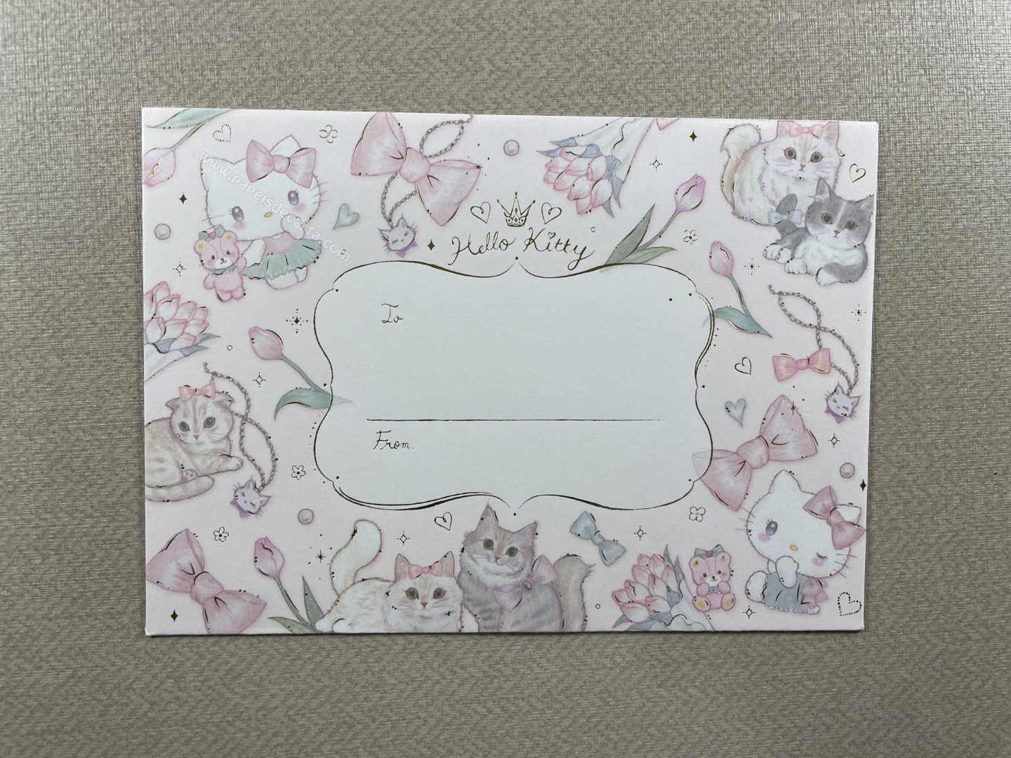Conjunto de papel de carta importado, tamanho médio, com 2 folhas e 1 envelope, da Hello Kitty - Sanrio. Possui detalhes em dourado.