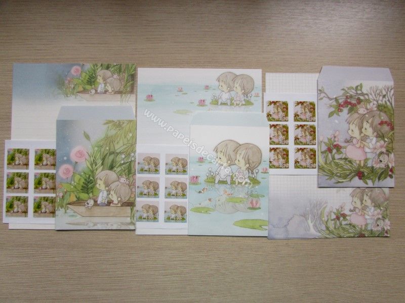 Lote de conjunto importado, de papel de carta tamanho médio da Amy & Tim, com 2 folhas iguais, 1 envelope e 3 cartelas de adesivo.