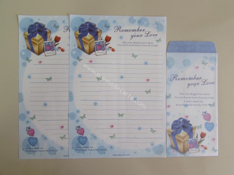 Conjunto importado, de papel de carta da Ninge, com 2 folhas iguais e 1 envelope. Frase: Remember your Love.