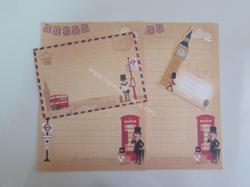 Conjunto importado, de papel de carta com 2 folhas iguais, 1 envelope e 1 notinha do Season. Frase: Let"s travel to London.