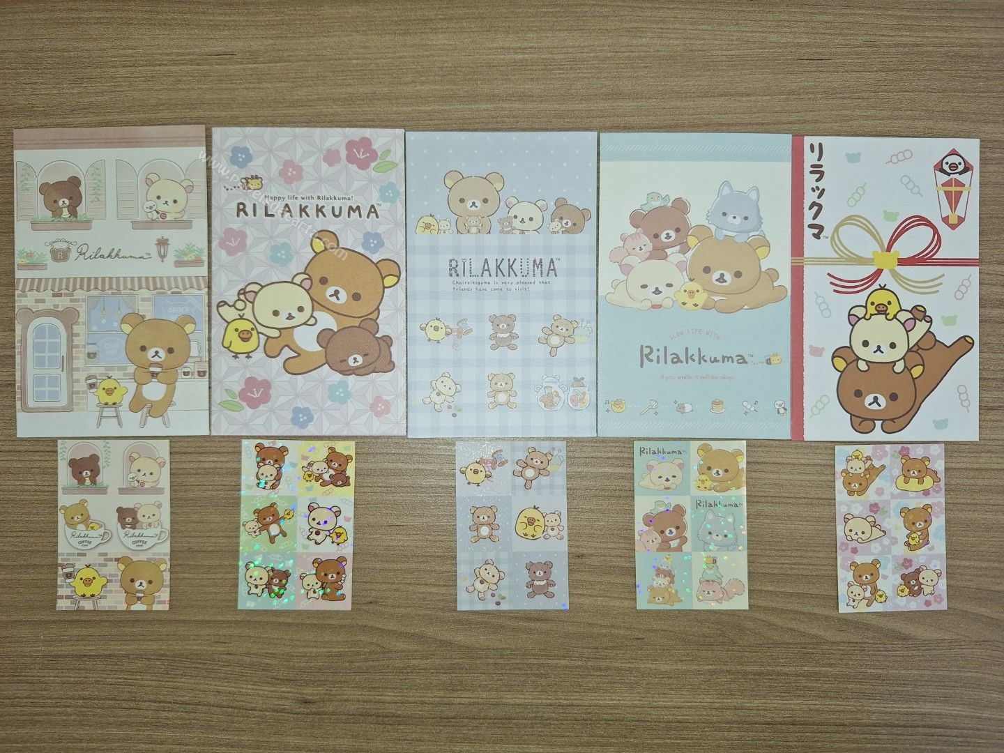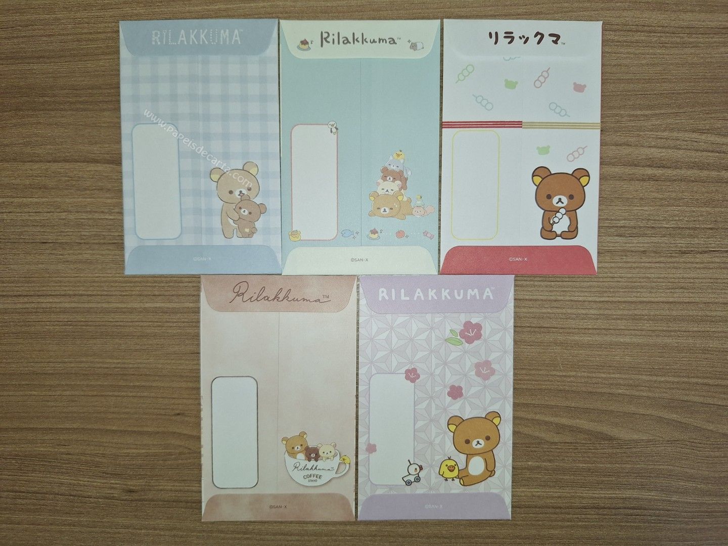 Lote com 5 envelopes e 5 cartelinhas de adesivos do Rilakkuma - San-X. Tamanho dos envelopes: 7cm larg x 11cm alt.