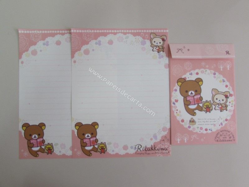 Conjunto de papel de carta importado, com 2 folhas iguais e 1 envelope da coleção Rilakkuma, da San-X. Frase: Everyday Happy with Natural motifs.