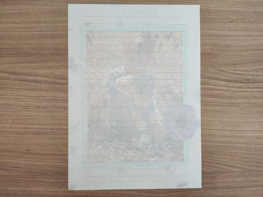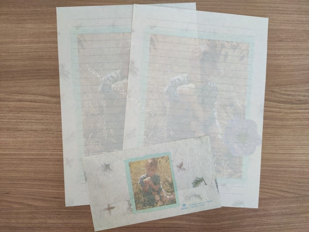 Papel de carta importado, clarinho, com cheirinho, tamanho um pouco maior que o médio, sendo 2 folhas iguais e 1 envelope.