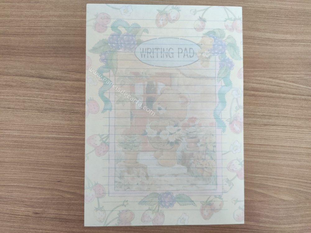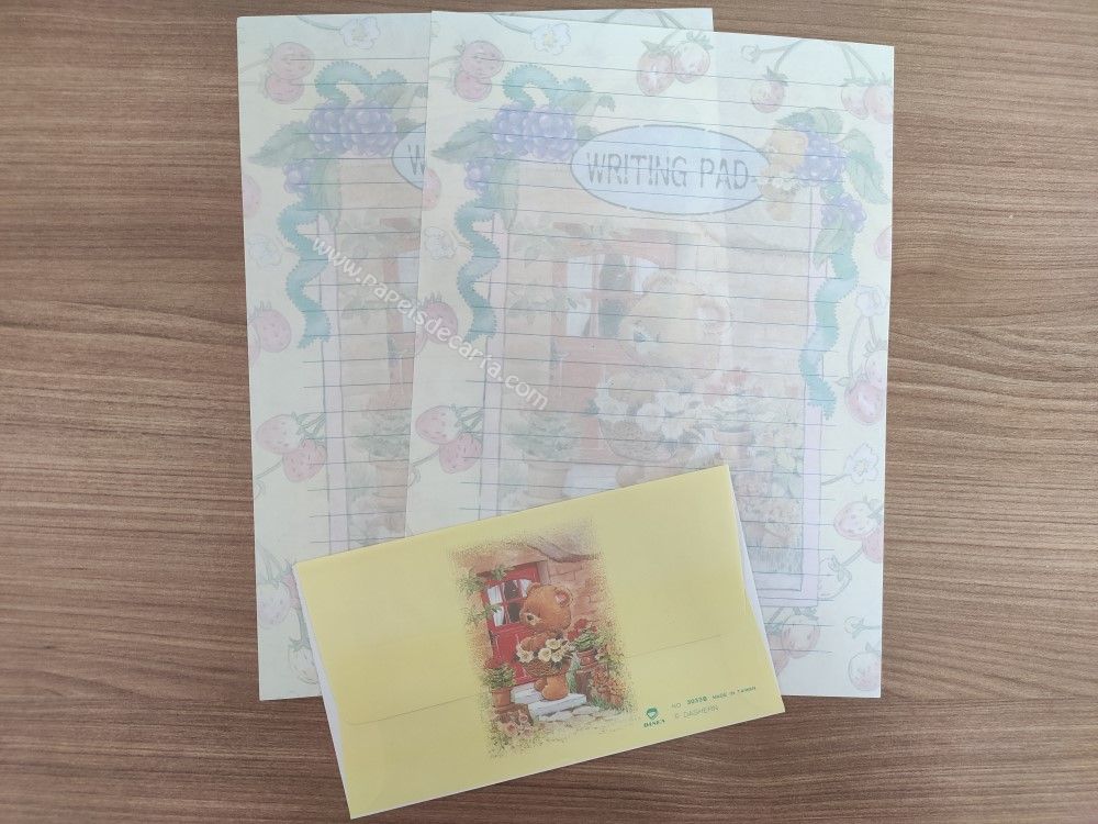 Papel de carta importado, clarinho, com cheirinho, tamanho um pouco maior que o médio, sendo 2 folhas iguais e 1 envelope.