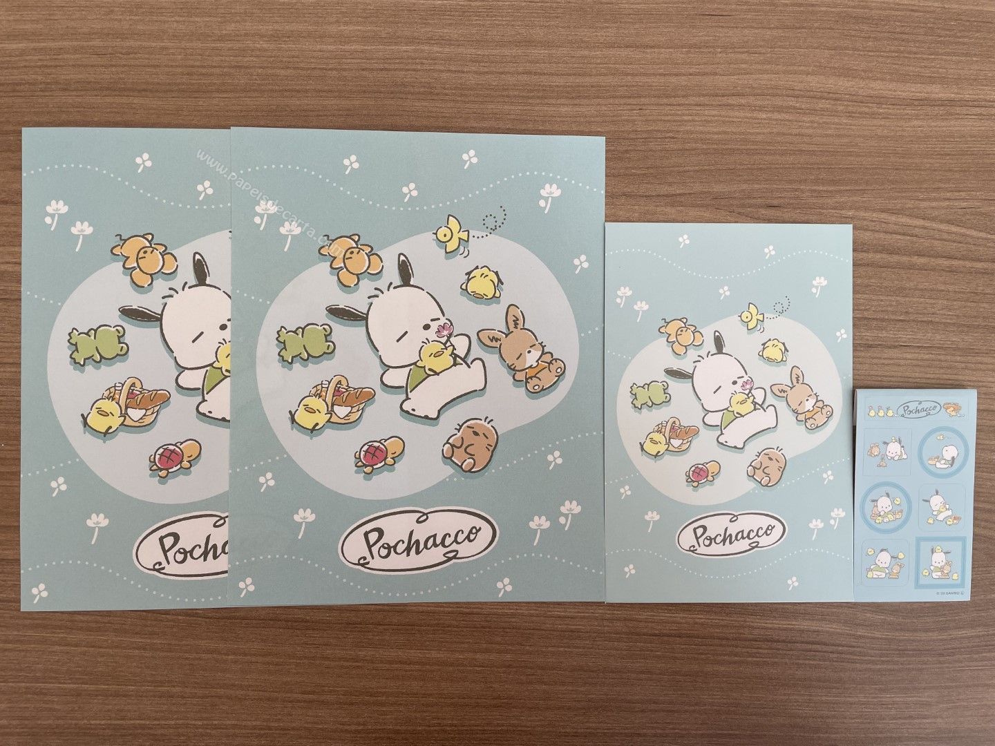 Conjunto importado, de papel de carta com 2 folhas e 1 envelope e 1 cartelinha de adesivos do Pochacco.
