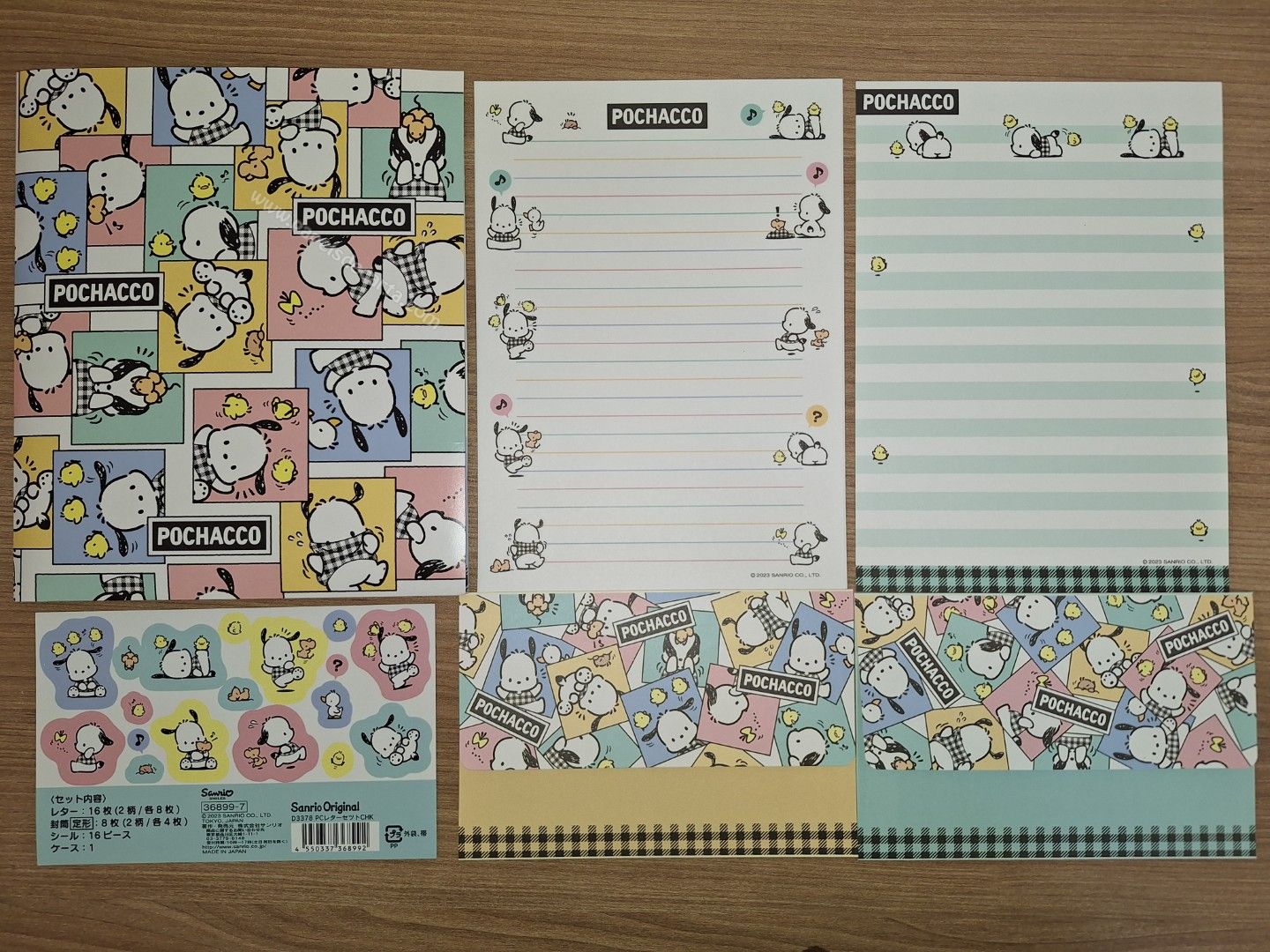Conjunto de Papel de carta com capinha de papelão, do Pochacco da Sanrio, com 2 conjuntos diferentes de papel de carta com 2 folhas e 1 envelope cada, tamanho médio e 1 cartela de adesivos.
