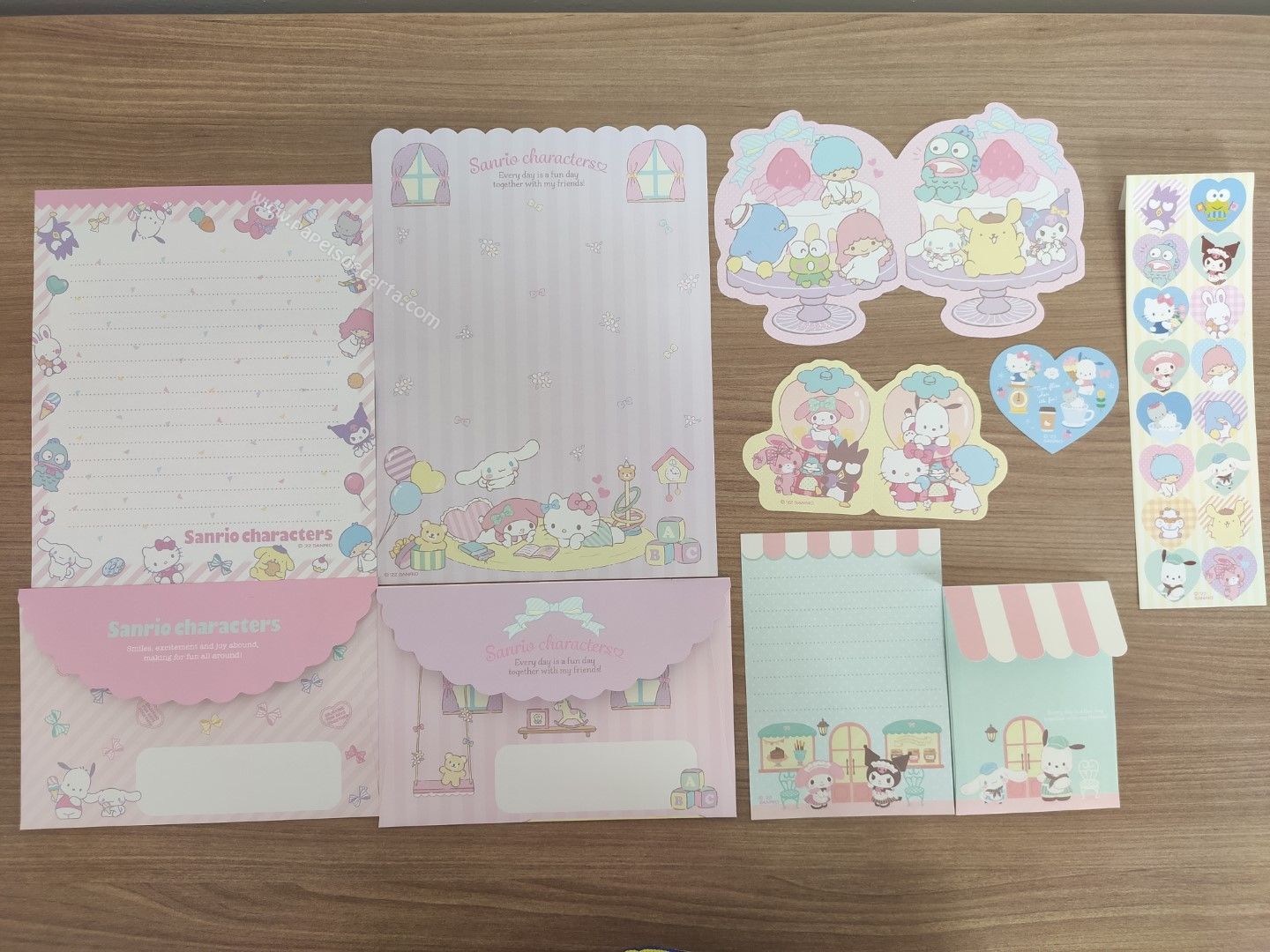 Lote de papel de carta importado com 2 conjuntos com 1 folha e 1 envelope cada, 1 mini conjunto, 3 memos e 1 cartela de adesivos.
